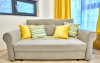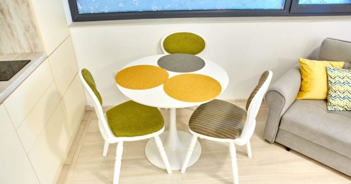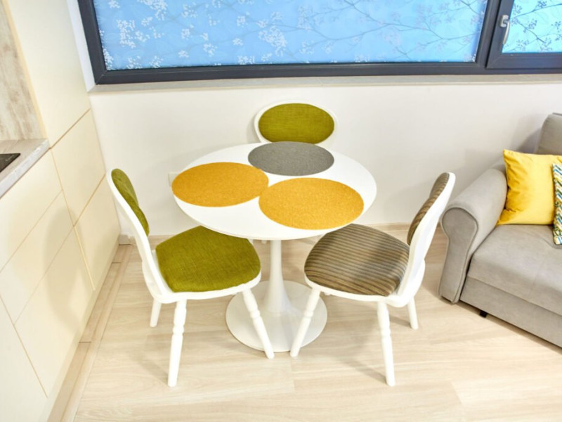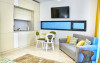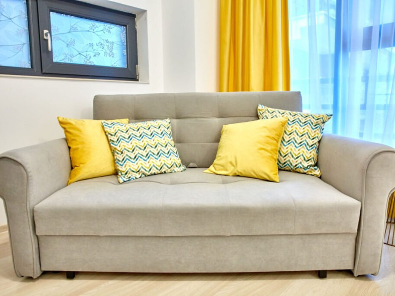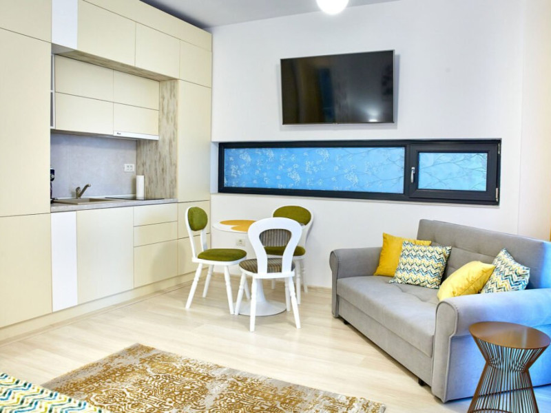 STUDIO GOLDEN cu o suprafata de 35 mp este dotat cu un pat matrimonial si canapea extensibila, bucatarie mobilata si utilata cu electronice si electrocasnice noi, masiina de splat rufe, baie cu cabina de dus, TV, internet, aer conditionat .