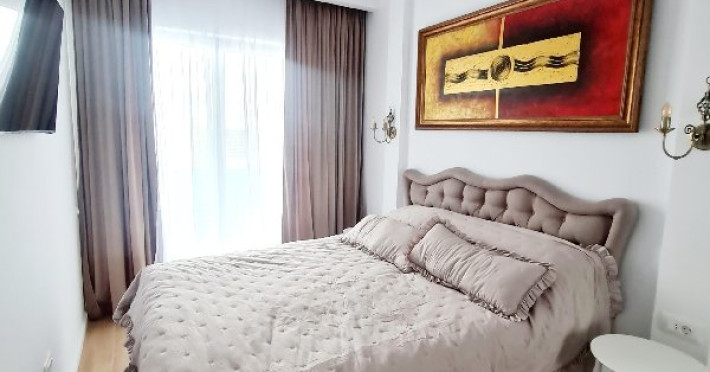 Dormitor: Acest spatiu este dominat de un pat matrimonial elegant, cu accente fine si o lenjerie de pat alba, invitanta. In fata patului, un televizor montat pe perete ofera oportunitatea de a te relaxa inainte de culcare. Draperiile inchise la culoare completeaza designul camerei, iar un dressing generos ofera solutii de depozitare optima pentru haine si accesorii.