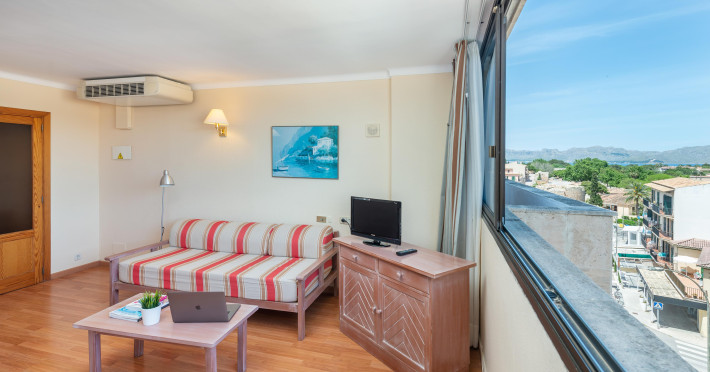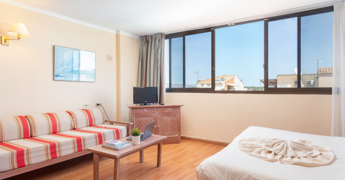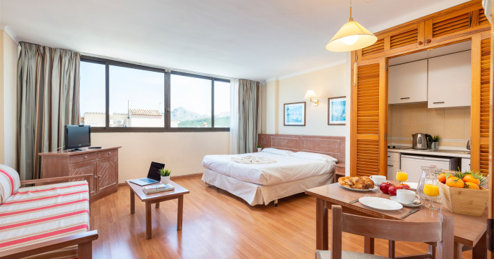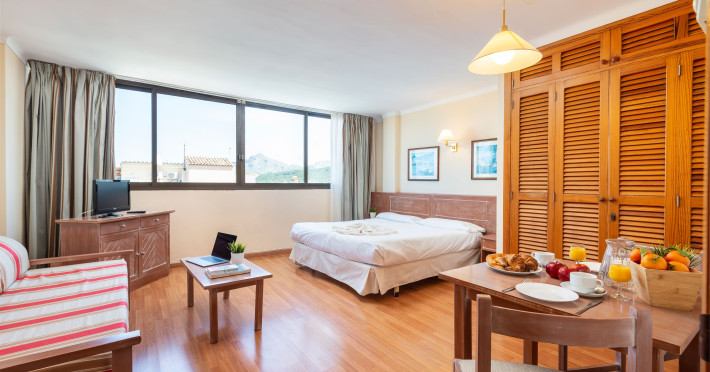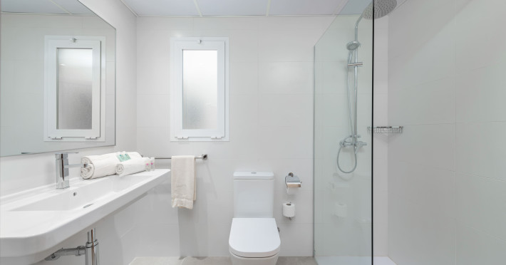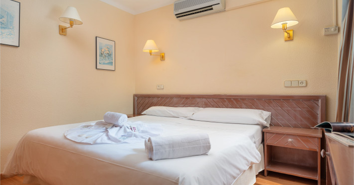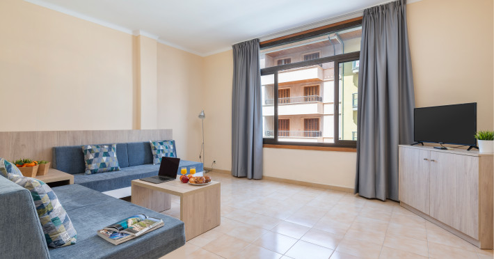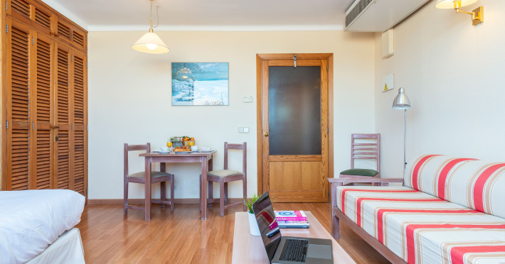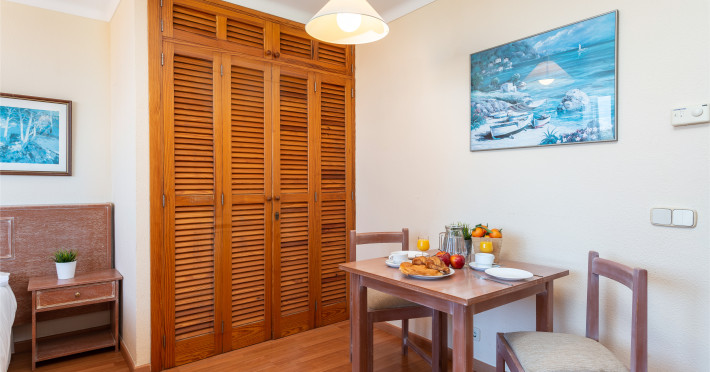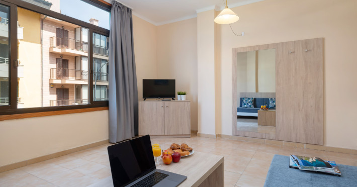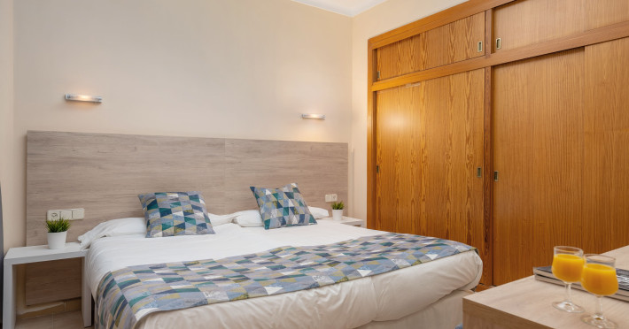 About 200 m from a beach is located the apart hotel APARTAMENTOS CARLOS V - MA. The nearest restaurants and bars can be reached in a few minutes on foot. The old town is also just a a few steps away. Shops are right on your doorstep, a supermarket is around 300 m away. Nearby there is a theatre which offers entertainment in high season. The air-conditioned, GPS-verified hotel has a reception, Wi-Fi, internet access, a lift, a first aid kit as well as a TV lounge with satellite TV. Furthermore, you can relax outdoors on a roof terrace. In addition, the hotel APARTAMENTOS CARLOS V - MA is video-monitored 24h a day. For very young guests, cots can also be provided. The energy supply is 220 Volts. In your hotel, a lot of focus is placed on sustainability. This includes the hotel`s own recycling bins, the provision of soap, shampoo and lotion dispensers, a central room air-conditioning and environmentally-friendly cleaning. Euro/Master Card is accepted as means of payment. Due to its barrier-free facilities , such as barrier-free entrances, wheelchair accessible rooms and a handrail in the elevator, the hotel is also suitable for wheelchair users. Distances