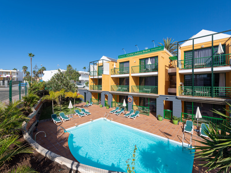 Around 200 m from a beach lies the aparthotel Apartamentos Cordial Judoca Beach (Adults Only). The nearest restaurants and bars can be reached in a few minutes on foot. The nearest shops you can reach within around 700 m. The hotel has a reception as well as Wi-Fi. In the outdoor area of the property you will find a pool (open all year). Furthermore, outside you can find a sun terrace. Distances