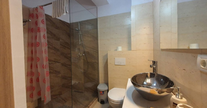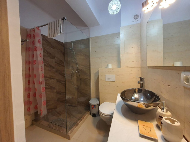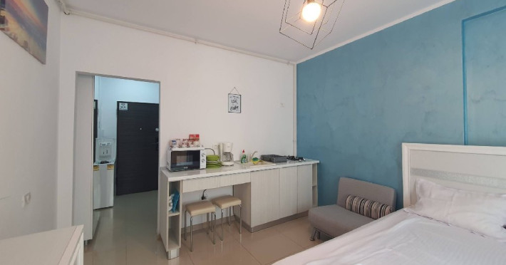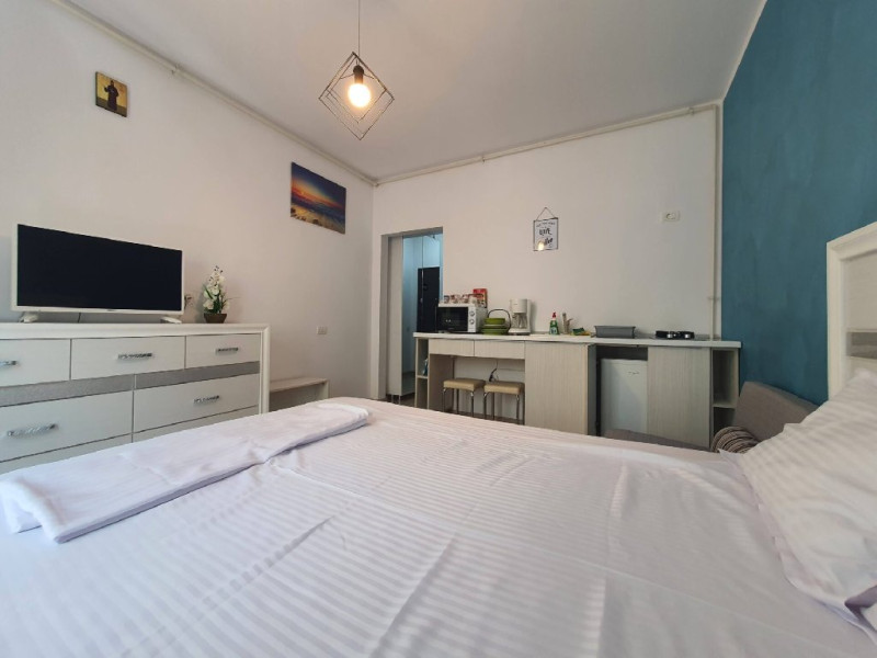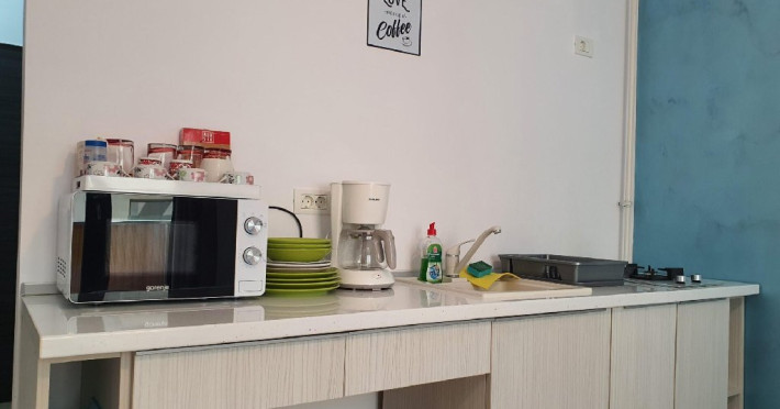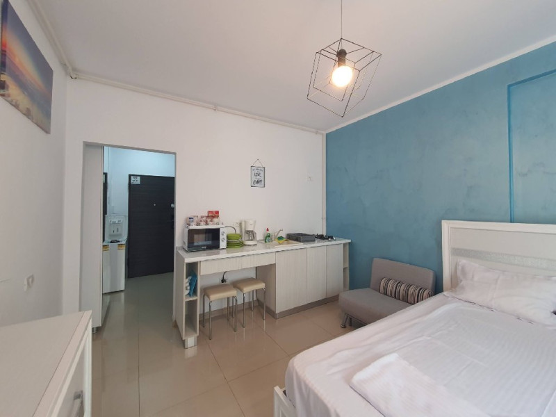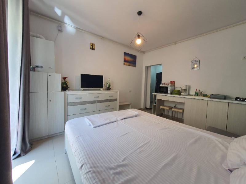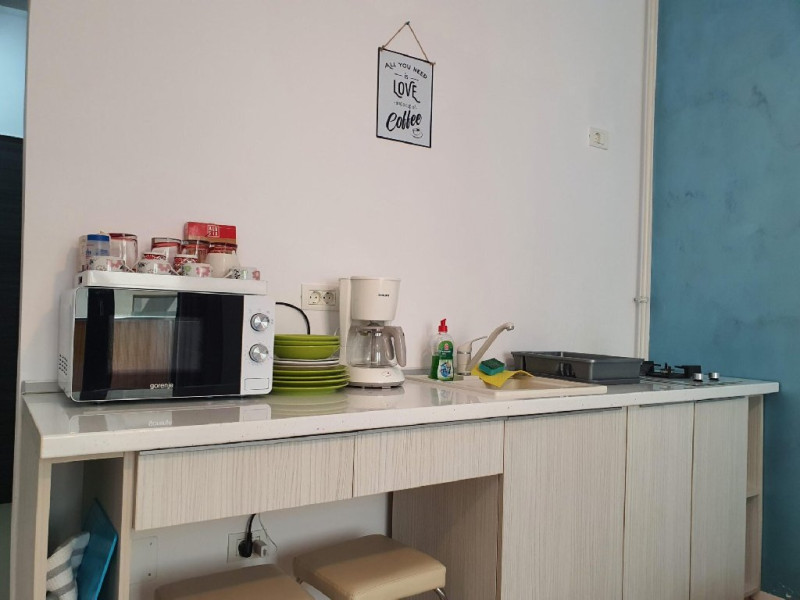 Bucataria este complet utilata, astfel incat sa puteti pregati cu usurinta mancarurile preferate. Baia dispune de o cabina de dus, iar in garsoniera veti gasi si o masina de spalat pentru a va face sederea mai confortabila.