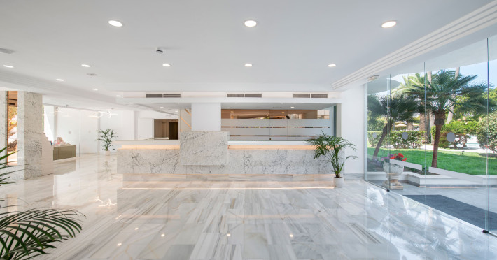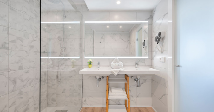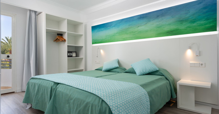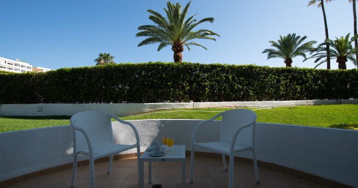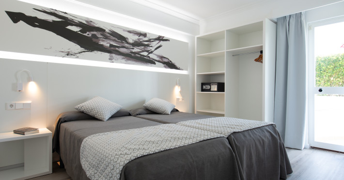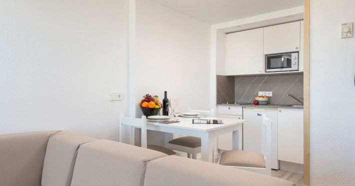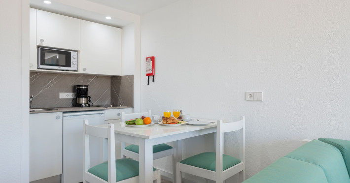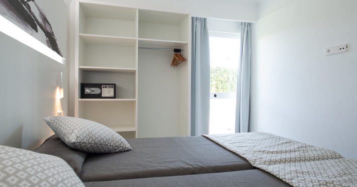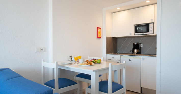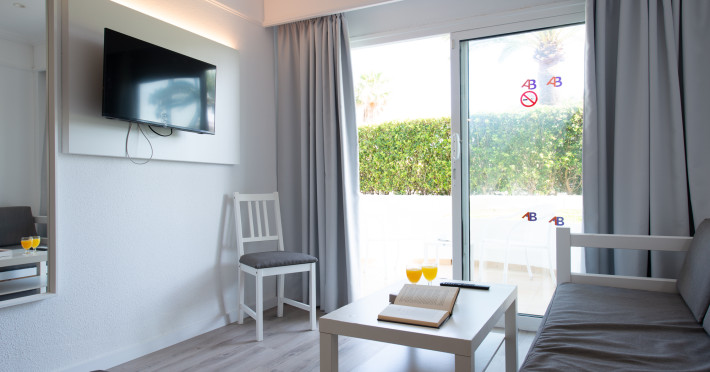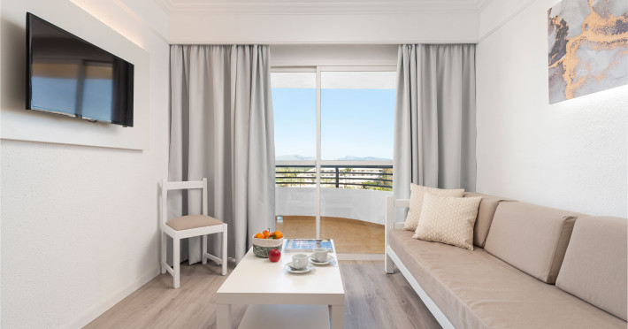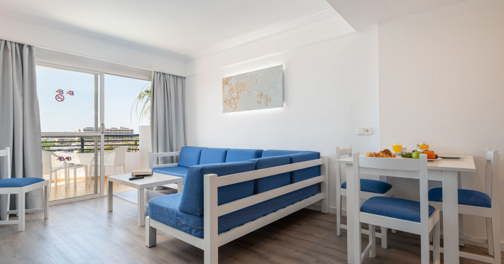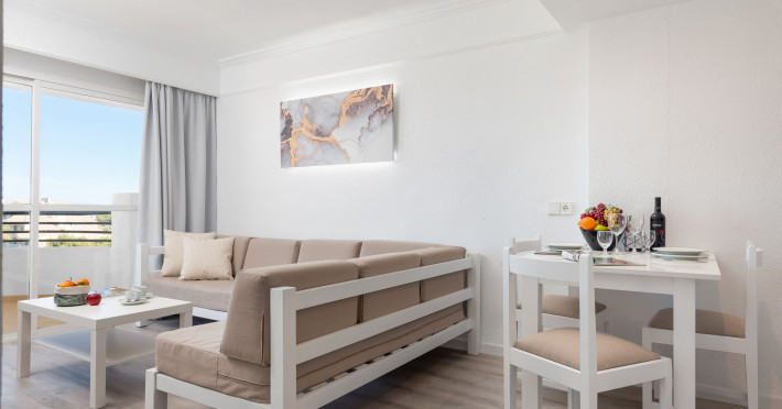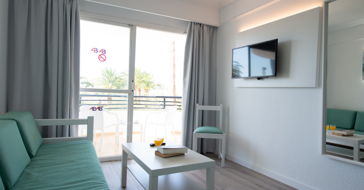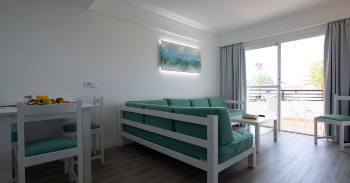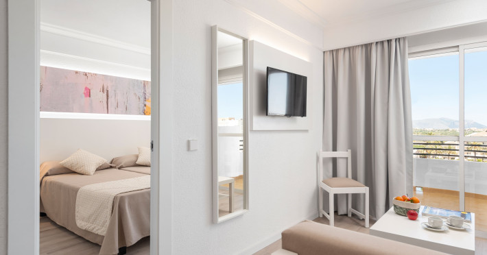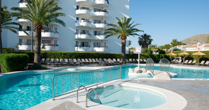 Around 300 m from a sandy beach and approximately 250 m from the sea is located the apart hotel APARTHOTEL ALCUDIA BEACH. The nearest restaurants and bars can be found within 200 m. The old town is around 750 m away. A supermarket and other shops you reach after around 150 m. The beach is patrolled by a lifeguard and awarded a blue flag. Directly next to the beach there is a promenade where you can take leisurely walks. The air-conditioned hotel is equipped with a 24h reception (check-in is possible around the clock), a lobby bar, 3 lifts, a first aid kit, parking spaces as well as a TV lounge with satellite TV. In the outdoor area you will find a garden as well as a pool that is open seasonally (open all year), where sun loungers, sun umbrellas and pool towels are available for free. For children there is also a children's pool. Furthermore, you can relax outdoors on the sun terrace. You can store your valuables in the safe, and your luggage in the hotel`s storage room. For very young guests, kid`s chairs, highchairs and cots can be provided. For the smallest children prams can be rented in the hotel. There is also a laundry service available at an additional cost to customers as well as an ironing service. If necessary, you can contact the medical centre at any time. Guests at the accommodation can get a wake-up call from the hotel personnel. If you want to explore the holiday region, you can use the car rental service close to the hotel (extra fee). At the reception, tickets are offered for excursions in the area. In your hotel, a lot of focus is placed on sustainability. This includes among others the hotel`s own recycling bins. Due to its barrier-free facilities , such as barrier-free entrances and wheelchair accessible rooms, the hotel is also suitable for wheelchair users. Catering As catering services the hotel offers all-inclusive. Breakfast is offered continental or from the buffet. Lunch and dinner are also served from the buffet. For the meals, there are a buffet restaurant (calorie-reduced, gluten-free and vegetarian dishes) and a bar, the cafeteria as well as the pool bar. A picnic bench can be used by guests for self-catering. Distances