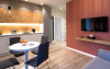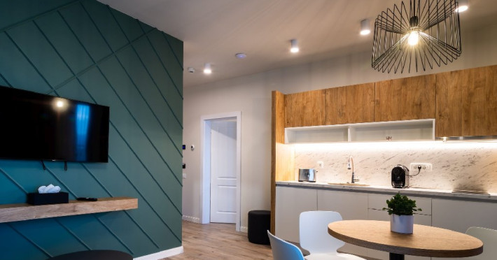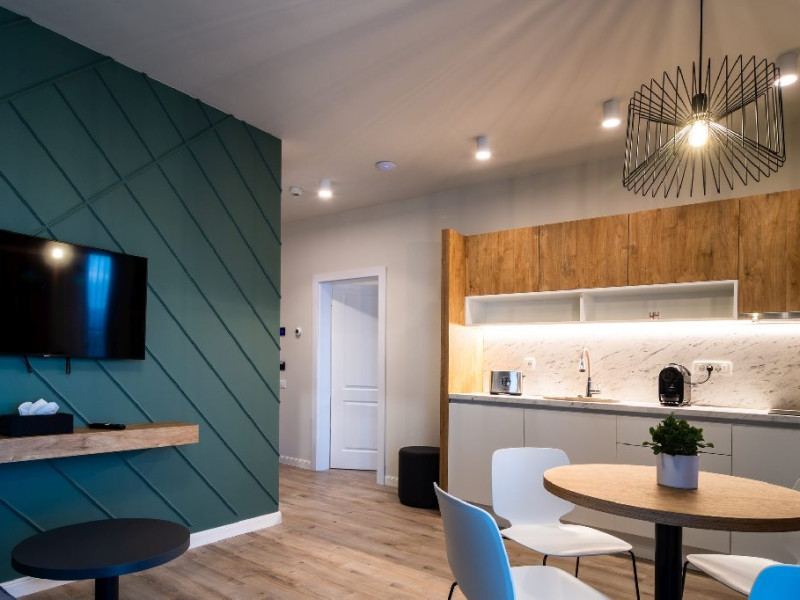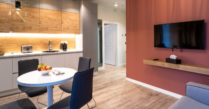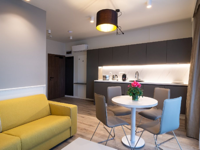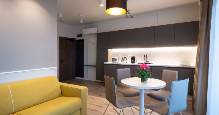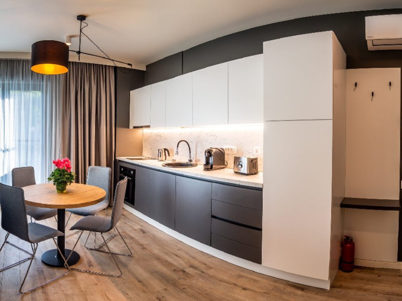 Apartamentele sunt spatioase, dotate cu toate facilitatile potrivite unei calatorii de afaceri, pentru un sejur in cuplu sau cu familia: sistem de acces inteligent, birou, living, bucatarie complet utilata (frigider, plita cu inductie, espressor, cuptor cu microunde, prajitor paine), minibar (produsele contra cost) dormitor si terasa sau balcon, WiFi gratuit, aer conditionat, TV cu ecran plat. Baile sunt dotate cu cabina de dus, uscator de par, prosoape, halate de baie si articole de toaleta gratuite.