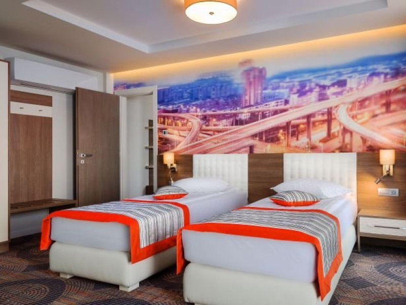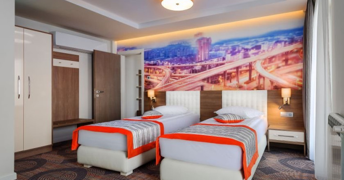 Apartamentul Twin are o suprafata de 50 mp si este format din dormitor cu doua paturi single, living, chicineta, baie si balcon.