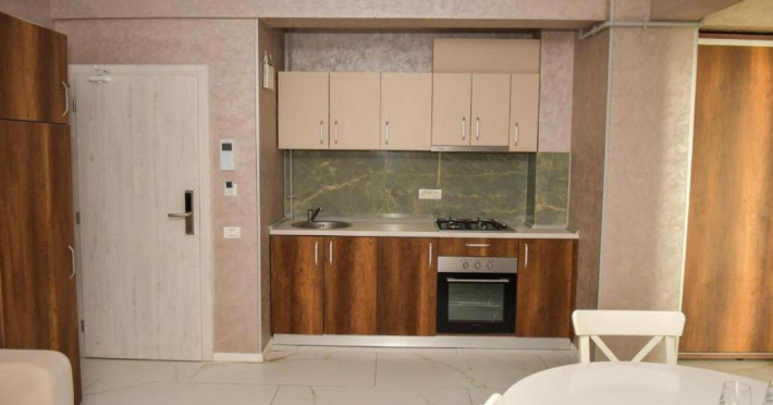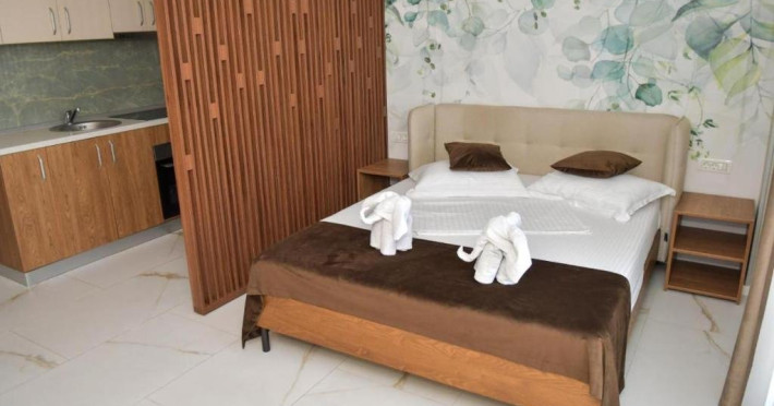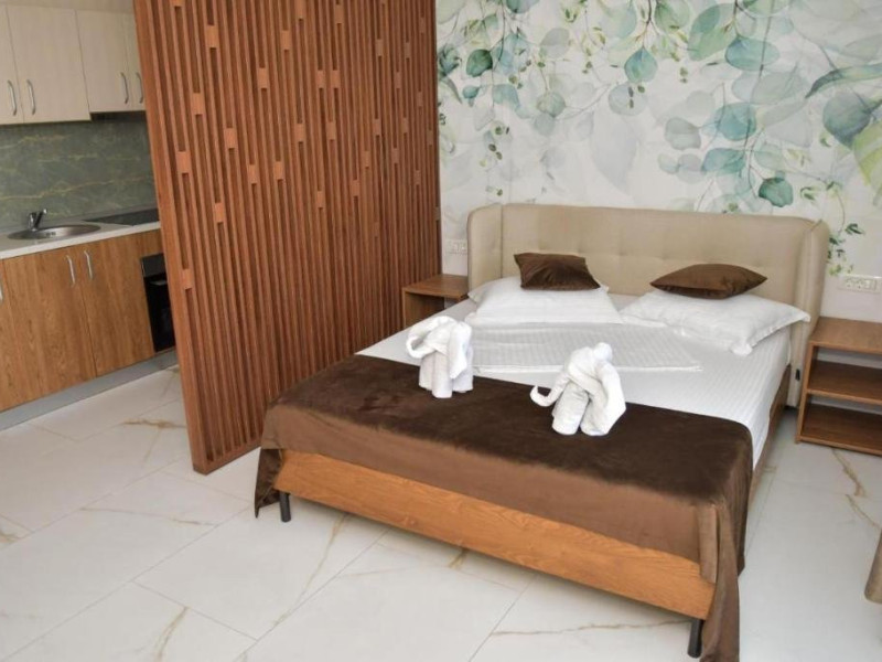Studio deluxe are in dotare pat matrimonial,TV, aer conditionat, baie cu dus/cada, articole de toaleta gratuite, uscator de par, bucataria complet utilata ce include plita, frigider, cuptor si balcon mobilat cu vedere la piscina. Suprafata 42 mp. Se pot caza 2 adulti si un copil.