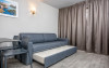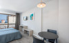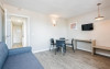 Facilitati studio: paturi twin, baie completa; chicinetă (utilata complet doar pentru studiouri si apartamente), frigider, cuptor cu microunde, telefon, TV, balcon.