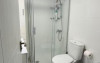 The modern bathroom has a shower, hairdryer, sink and toilet. The toilet has a sink, toilet and closet.