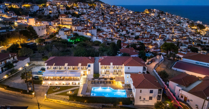 Our Hotel in Skopelos Island was built according to the local architecture of the Sporades and it provides comfortable, clean rooms with air conditioning, private bathroom, private balcony, refrigerator, TV and various other facilities. Some of our rooms offer an independent balcony with a magnificent sea view so that guests can relax and enjoy either the view of the Aegean Sea, the view of Skopelos port or the view of our swimming pool.Among the amenities of our complex are included: swimming pool, fax, reception, and safe deposit box, free parking lot for the cars of our guests, free Wi-Fi internet connection in all areas of the hotel, unique breakfast buffet and much more! In addition, for those who wish to relax and enjoy the tranquility of the Greek Island, we offer a beautiful green garden next to the swimming pool area. Therefore, you can stroll around the garden or relax at the sunny private veranda of your room.The most important feature of our accommodation is the sincere sense of hospitality. Aperitton Hotel’s staff is always willing to help you and to fulfill your needs during your holidays.Our Hotel in Skopelos Island was built according to the local architecture of the Sporades and it provides comfortable, clean rooms with air conditioning, private bathroom, private balcony, refrigerator, TV and various other facilities. Some of our rooms offer an independent balcony with a magnificent sea view so that guests can relax and enjoy either the view of the Aegean Sea, the view of Skopelos port or the view of our swimming pool.Among the amenities of our complex are included: swimming pool, fax, reception, and safe deposit box, free parking lot for the cars of our guests, free Wi-Fi internet connection in all areas of the hotel, unique breakfast buffet and much more! In addition, for those who wish to relax and enjoy the tranquility of the Greek Island, we offer a beautiful green garden next to the swimming pool area. Therefore, you can stroll around the garden or relax at the sunny private veranda of your room.The most important feature of our accommodation is the sincere sense of hospitality. Aperitton Hotel’s staff is always willing to help you and to fulfill your needs during your holidays.
