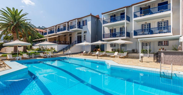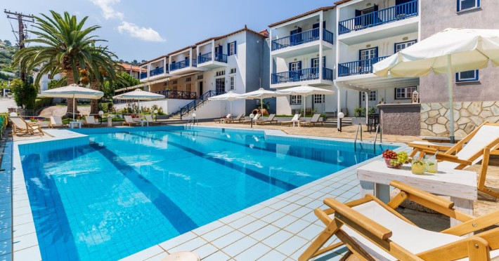Situat in centrul orasului Skopelos, hotelul este ideal atat pentru familiile cu copii, dar si pentru tineri. Decorul simplu, combinat cu elementele traditionale si culorile alb albastru, creeaza un mediu unic pentru vacanta.