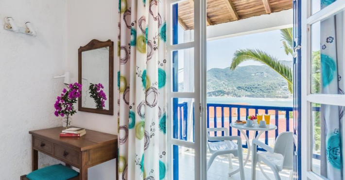 Double Room with Sea View: acest tip de camera este la etajul 2 al hotelului. Are balcon privat cu vedere la portul Skopelos si la Marea Egee.