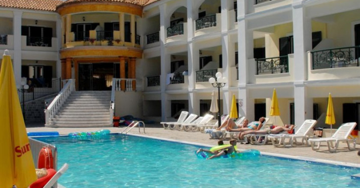 Complexul este format din 4 clădiri separate, înconjurate de grădini luxuriante, amenajate și întreținute, cu un total de 39 de apartamente și o piscină mare în centrul acestora. Hotelul dispune de: aer conditionat, schimb de casete, sezlonguri si umbrele, mobilier de gradina, asternuturi, masa de biliard, piscina, snack bar, TV.