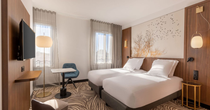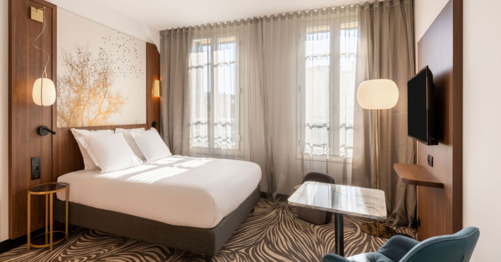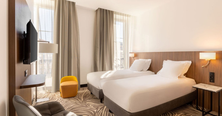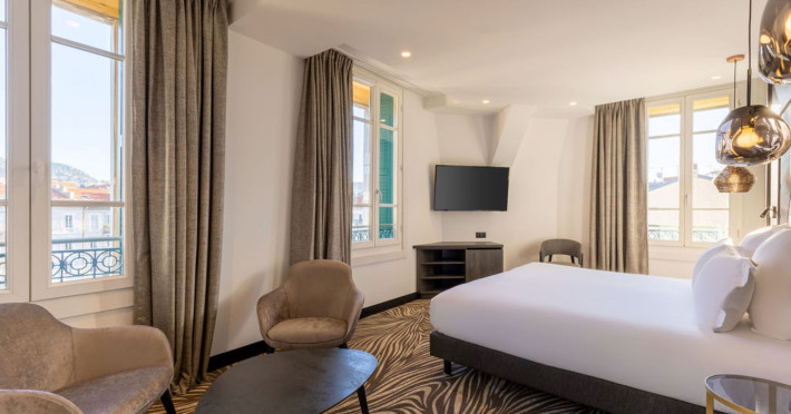 About 850 m from a beach is located the hotel Hôtel Apollinaire Nice. The nearest bars and restaurants are located directly next to the building. The old town is around 500 m away. A supermarket and other shops you reach after around 200 m. There is a 24h shuttle service between the hotel and the airport (for a fee) 24h a day. Nearby there is a theatre and a cinema which offer entertainment in high season. On the beach are beach towels for a fee available. The air-conditioned, GPS-verified hotel is equipped with a 24h reception, a lounge, a lobby bar, Wi-Fi, internet access, 2 lifts as well as a first aid kit. Furthermore, you can relax outdoors on the terrace. You can store your valuables in the safe, and your luggage in the hotel`s storage room. In addition, the hotel Hôtel Apollinaire Nice is video-monitored 24h a day. For very young guests, kid`s chairs can be provided. There is also a laundry service available at an additional cost to customers. For your comfort there is a concierge service. For conventions and other business meetings, the hotel offers a conference area with a total of 8 seats, printer as well as internet access. Pets like cats and dogs are allowed in the hotel (for a fee). For guests on their honeymoon, the hotel has special offers such as a romantically-decorated room, special honeymoon packages, champagne or flowers in the room. In your hotel, a lot of focus is placed on sustainability. This includes waste segregation in the rooms, the hotel`s own recycling bins, the provision of soap and shampoo dispensers and environmentally-friendly cleaning. The hotel requires that all guests pay a deposit upon arrival. American Express, Euro/Master Card and EC cards are accepted as means of payment. Due to its barrier-free facilities , such as a sliding door in the entrance area, an automatic hotel door, a hotel door that can be opened manually, barrier-free entrances, wheelchair accessible rooms, a wheelchair accessible lift, a handrail in the elevator and wheelchair-accessible bathrooms, the hotel is also suitable for wheelchair users. Catering Breakfast is offered from the buffet or à la carte (extras on request). For the meals, there are a restaurant (gluten-free and vegetarian dishes) and a bar. The drinks menu of the hotel includes water, soft drinks, coffee and tea, beer and wine. Distances- Discotheque: approximately at 800 m