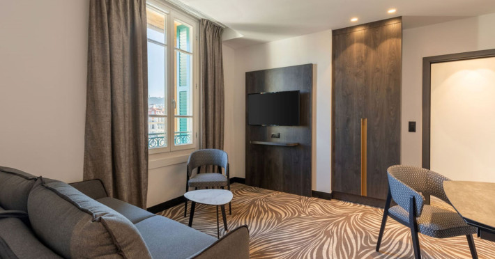 About 850 m from a beach is located the hotel Hôtel Apollinaire Nice. The nearest bars and restaurants are located directly next to the building. The old town is around 500 m away. A supermarket and other shops you reach after around 200 m. There is a 24h shuttle service between the hotel and the airport (for a fee) 24h a day. Nearby there is a theatre and a cinema which offer entertainment in high season. On the beach are beach towels for a fee available. The air-conditioned, GPS-verified hotel is equipped with a 24h reception, a lounge, a lobby bar, Wi-Fi, internet access, 2 lifts as well as a first aid kit. Furthermore, you can relax outdoors on the terrace. You can store your valuables in the safe, and your luggage in the hotel`s storage room. In addition, the hotel Hôtel Apollinaire Nice is video-monitored 24h a day. For very young guests, kid`s chairs can be provided. There is also a laundry service available at an additional cost to customers. For your comfort there is a concierge service. For conventions and other business meetings, the hotel offers a conference area with a total of 8 seats, printer as well as internet access. Pets like cats and dogs are allowed in the hotel (for a fee). For guests on their honeymoon, the hotel has special offers such as a romantically-decorated room, special honeymoon packages, champagne or flowers in the room. In your hotel, a lot of focus is placed on sustainability. This includes waste segregation in the rooms, the hotel`s own recycling bins, the provision of soap and shampoo dispensers and environmentally-friendly cleaning. The hotel requires that all guests pay a deposit upon arrival. American Express, Euro/Master Card and EC cards are accepted as means of payment. Due to its barrier-free facilities , such as a sliding door in the entrance area, an automatic hotel door, a hotel door that can be opened manually, barrier-free entrances, wheelchair accessible rooms, a wheelchair accessible lift, a handrail in the elevator and wheelchair-accessible bathrooms, the hotel is also suitable for wheelchair users. Catering Breakfast is offered from the buffet or à la carte (extras on request). For the meals, there are a restaurant (gluten-free and vegetarian dishes) and a bar. The drinks menu of the hotel includes water, soft drinks, coffee and tea, beer and wine. Distances