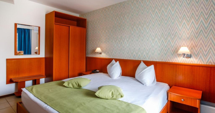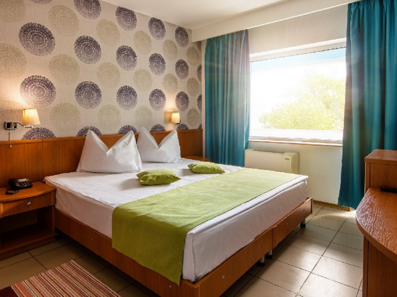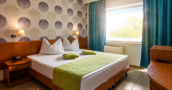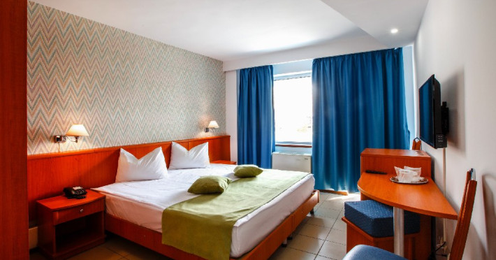 - 57 camere duble SUNSET orientate catre lacul Siutghiol. Jumatate din numarul camerelor hotelului sunt camere duble dotate cu 2 paturi twin (care se pot uni) si au ca facilitati balcon, grup sanitar propriu cu dus, pardoseli din gresie si tamplarie cu geam termopan, Cealalta jumatate a camerelor sunt dotate cu paturi matrimoniale . Toate camerele dispun de frigider, telefon, LCD, televiziune prin cablu si aer conditionat si binenteles wi-fi gratuit. Camerele se afla la etaj.