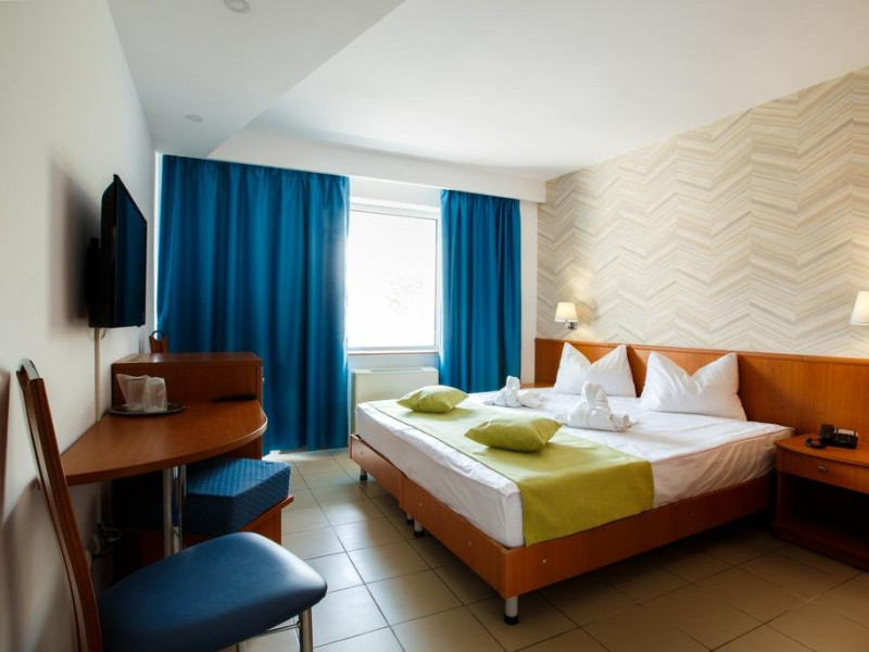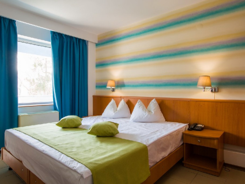 - 57 camere duble SUNRISE, orientate catre mare. Jumatate din numarul camerelor hotelului sunt camere duble dotate cu 2 paturi twin (care se pot uni) si au ca facilitati balcon, grup sanitar propriu cu dus, pardoseli din gresie si tamplarie cu geam termopan, Cealalta jumatate a camerelor sunt dotate cu paturi matrimoniale . Toate camerele dispun de frigider, telefon, LCD, televiziune prin cablu si aer conditionat si binenteles wi-fi gratuit. Camerele se afla la etaj.