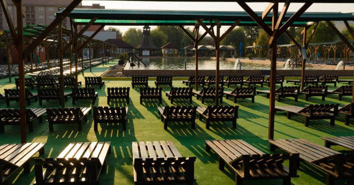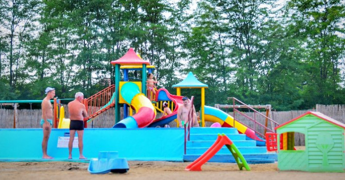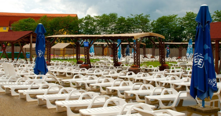 Strand cu o suprafata de 24000 mp: piscina cu apa dulce, bazin cu apa sarata, plaja cu nisip, zone de relaxare, beach volei, servicii de alimentatie in zona Paradisul Verde, servicii de masaj si intretinere corporala.