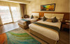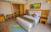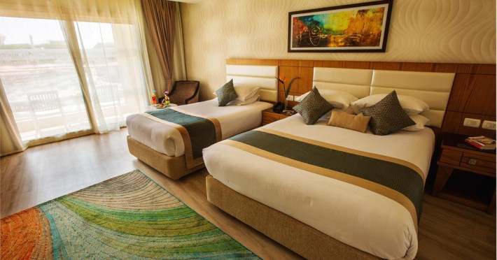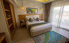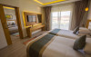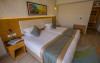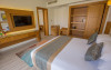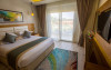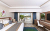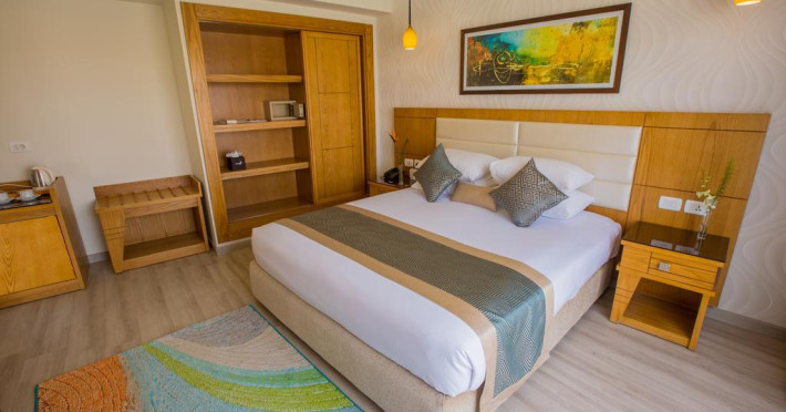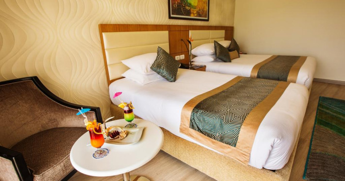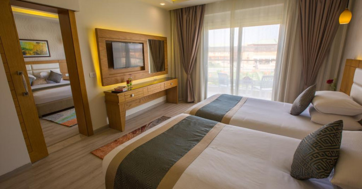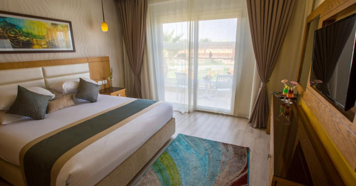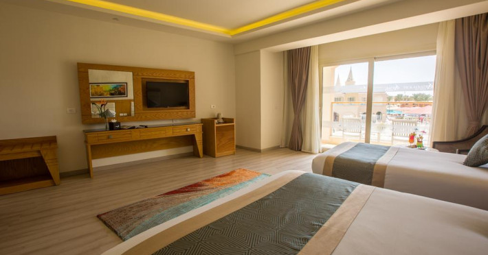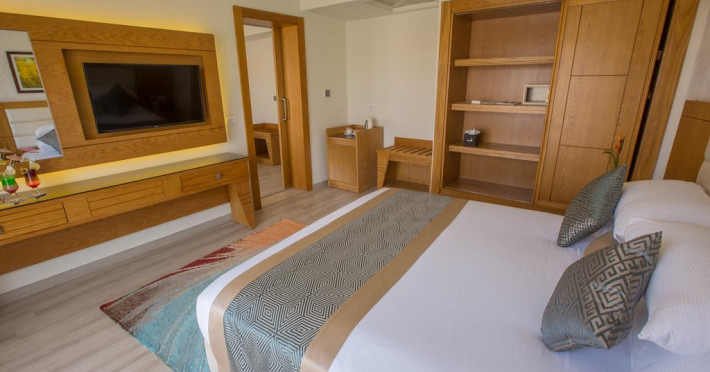 Sunt disponibile 538 camere. Camerele confortabile de la Aqua Blu Resort au pardoseală de gresie/ marmură, aer condiționat, Tv cu canale prin satelit și seif. Fiecare cameră dispune de minibar și cană-fierbător. Oaspeții pot solicita serviciul de room service pentru a servi masa sau diverse băuturi. Unele camere au balcon cu vedere la grădină sau la piscină. În camere există baie cu cadă sau duș ce are în dotare foehn și articole de toaletă gratuite. Oaspeții au acces gratuit la serviciul Wi-fi în camere. Curățenia in cameră se face zilnic. Toate camerele spațioase de la Aqua Blu Resort au zonă de relaxare cu canapea, ceea ce oferă un plus de confort. Proprietatea oferă camere pentru familie cu o suprafață mai mare și un număr mai mare de paturi față de cele standard. Se pot rezerva de asemenea camere pentru nefumători.