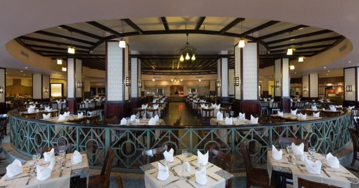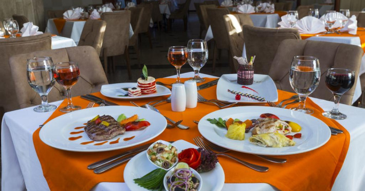 La Aqua Blu Resort oaspeții au la dispoziție 5 restaurante unde pot savura mâncăruri delicioase, în stil bufet sau à la carte. Preparate din bucătăria internațională, mediteraneeană și italiană propun mâncăruri pentru gusturi diverse.. Masa poate fi servită atât în interior, cît si în aer liber, pe terasă, în funcție de vreme. Oaspeţii pot avea diverse băuturi răcoritoare sau alcoolice la bar. De asemenea , în cadrul proprietății, există cafenea și snack bar ideale pentru o gustare rapidă. Pentru cei cu anumite nevoi de nutriție, Aqua Blu Resort oferă meniuri pentru diete speciale.