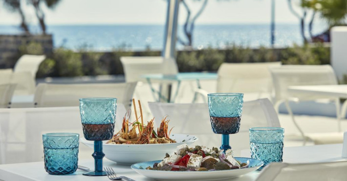 La Aqua Blue oaspeții au la dispoziție un restaurant care servește mâncare în stil bufet. Bucătăria mediteraneană de la Aqua Blue propune preparate delicioase care satisfac gusturi diverse. Masa poate fi servită atât în interior, cît si în aer liber, pe terasă, în funcție de vreme. Oaspeţii pot avea diverse băuturi răcoritoare sau alcoolice la bar.