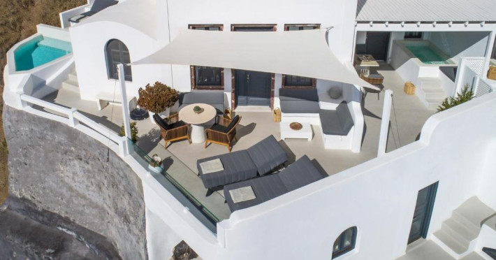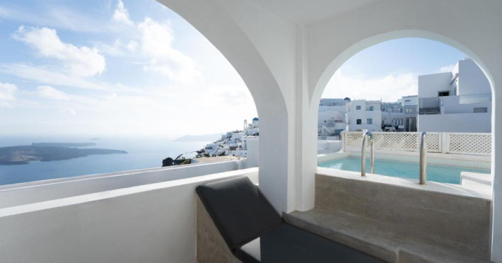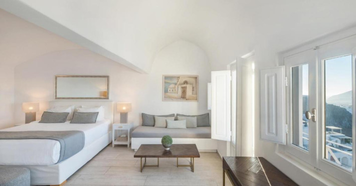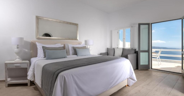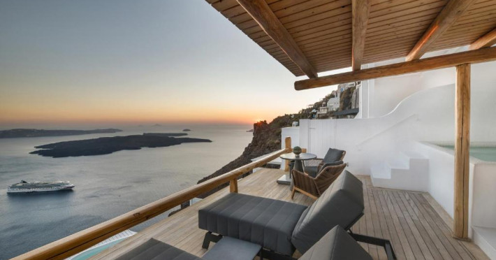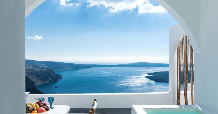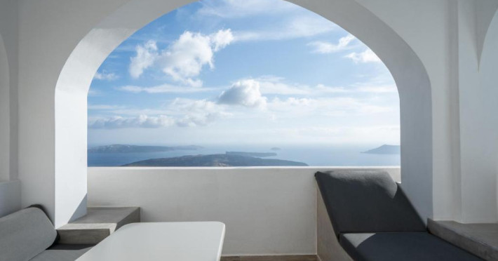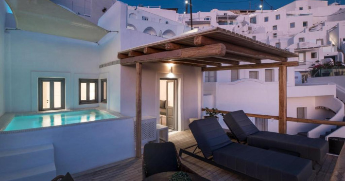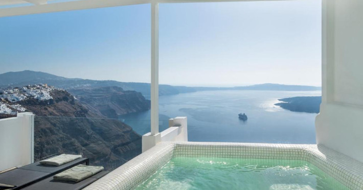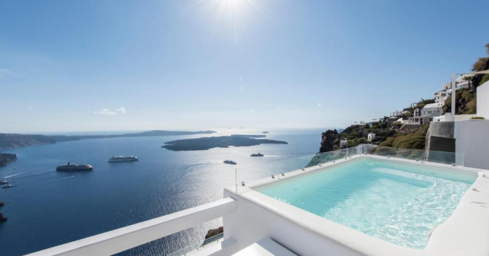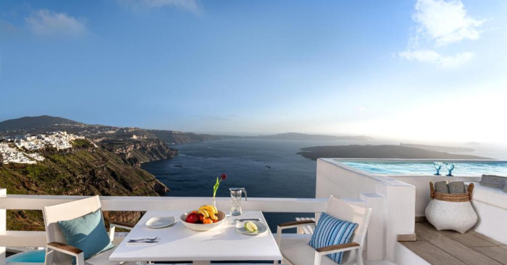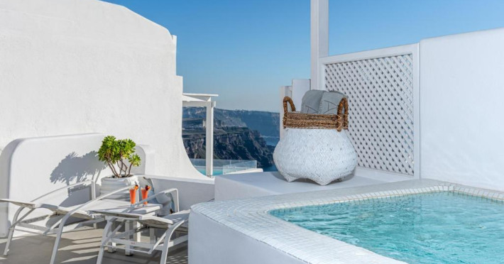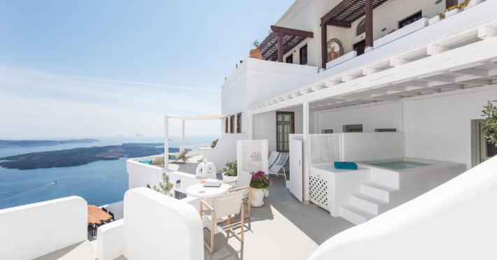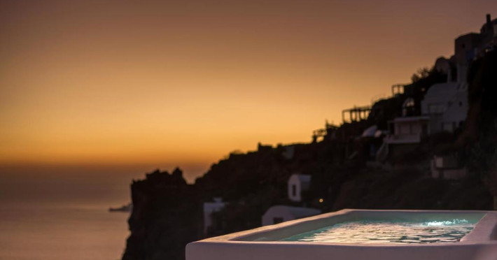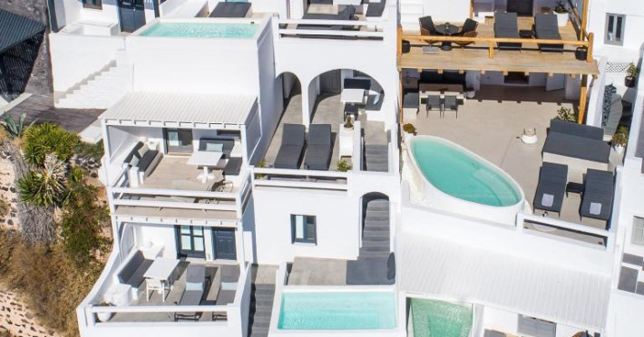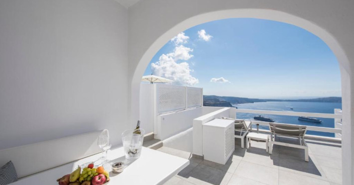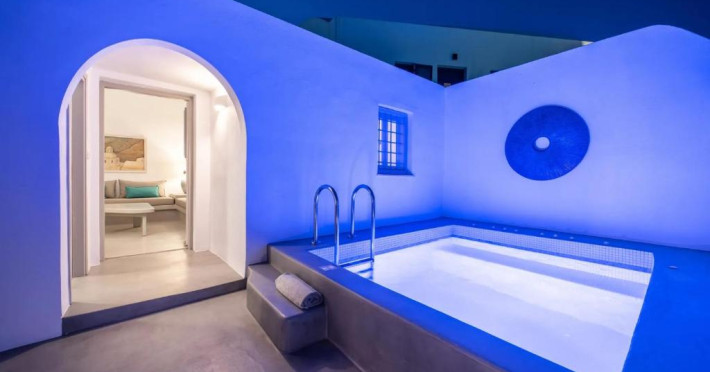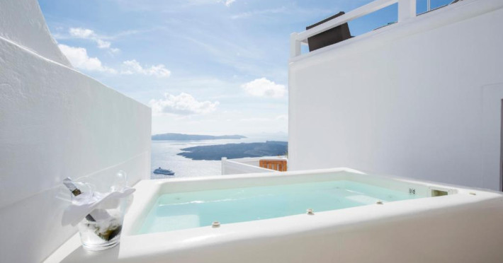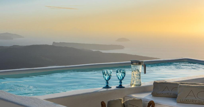 Amplasat in Imerovigli, complexul Aqua Luxury Suites, potrivit pentru familii și cupluri, oferă suite și vile de lux intr-un cadru inspirator și oferă vedere la caldeiră și la vulcan.