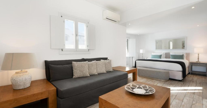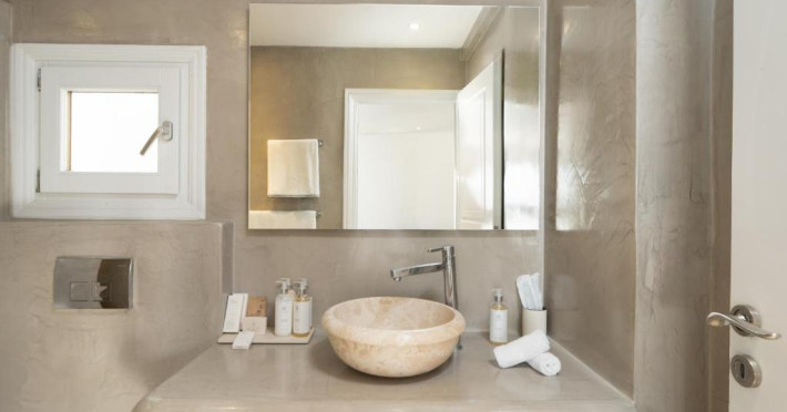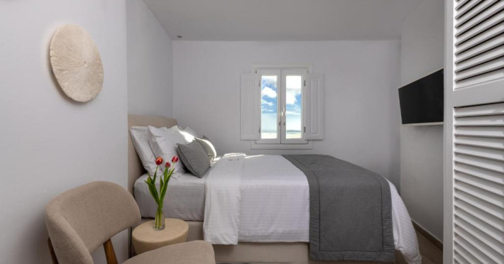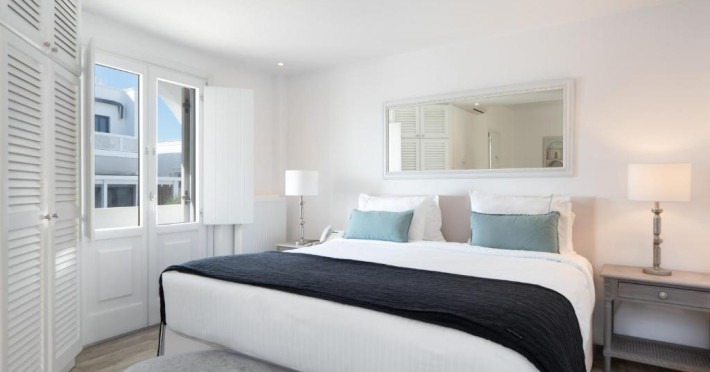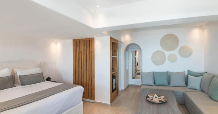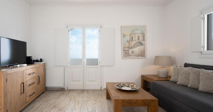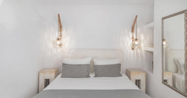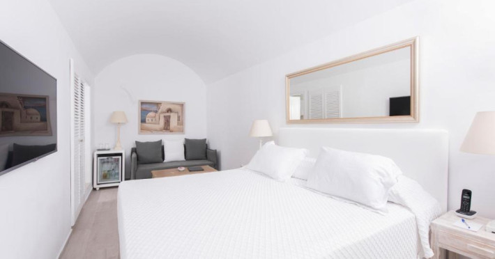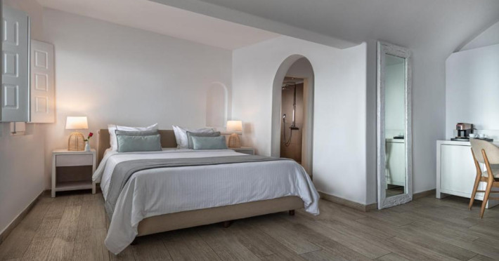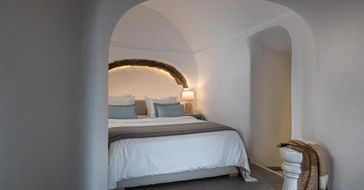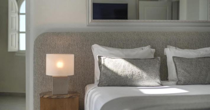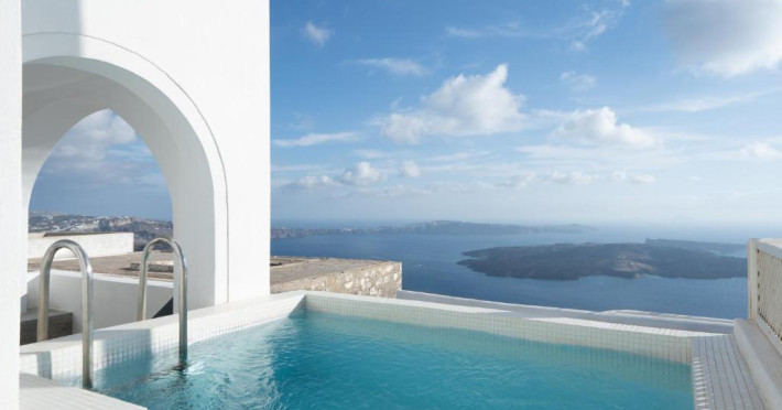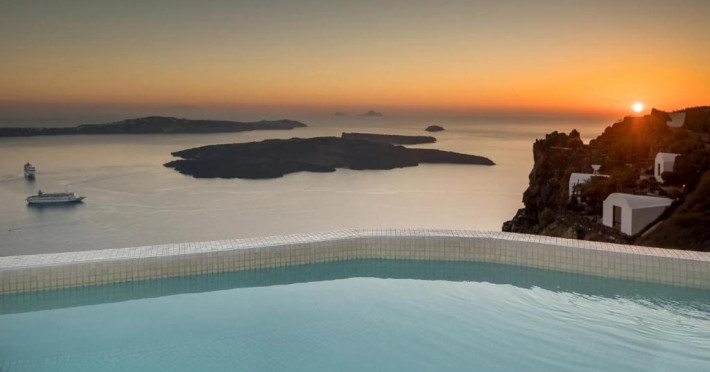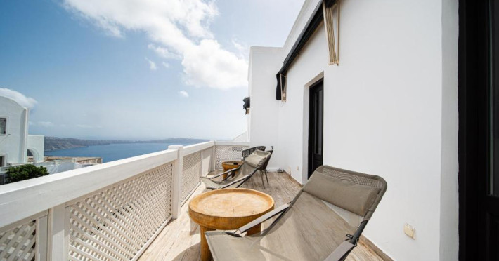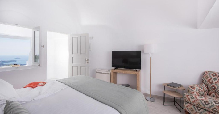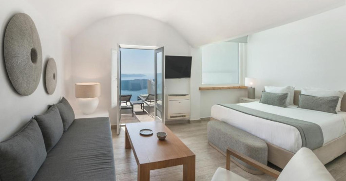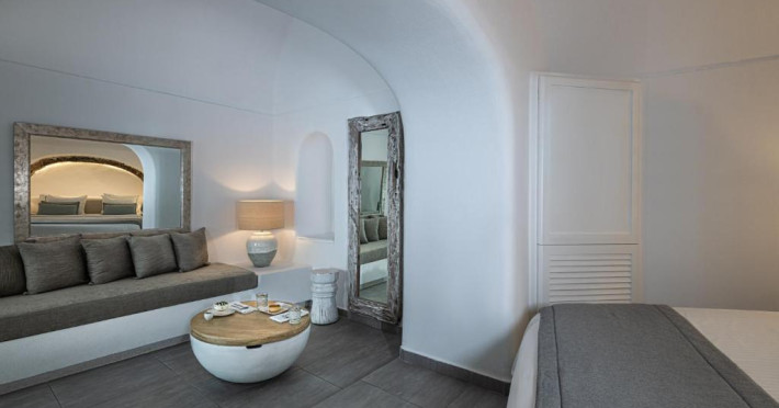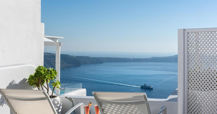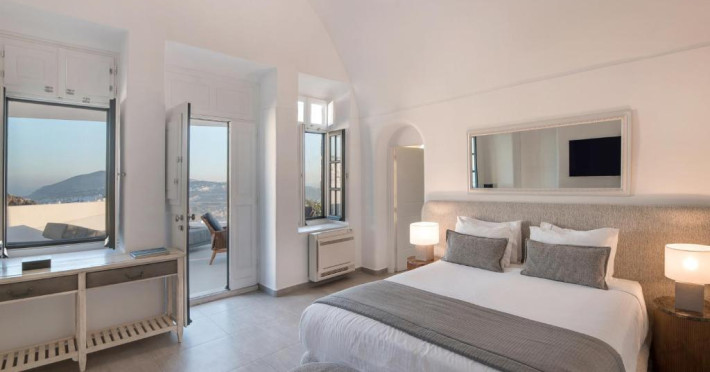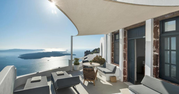 Amplasat in Imerovigli, complexul Aqua Luxury Suites, potrivit pentru familii și cupluri, oferă suite și vile de lux intr-un cadru inspirator și oferă vedere la caldeiră și la vulcan.