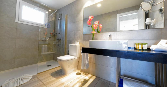 Fiecare suită modernă Aqua Suites are o terasă privată mobilată și aer condiționat. Există un TV prin satelit, o zonă de living cu ceainic și frigider și o baie cu uscător de păr și articole de toaletă gratuite.