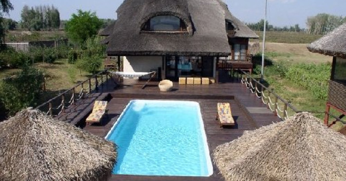 Suprafata locatiei 3 000 mp: Amplasamentul 3 corpuri de cladire Dispunerea camerelor sunt grupate cate 3, 2 la parter si ce-a de-a III-a la mansarda; Dotari suplimentare Bar restaurant Capacitatea de cazare 6 camere de cate 2 locuri; Transport, distractie 2 salupe moderne de cate 8 si 5 locuri si barci din lemn, piscina, calarie