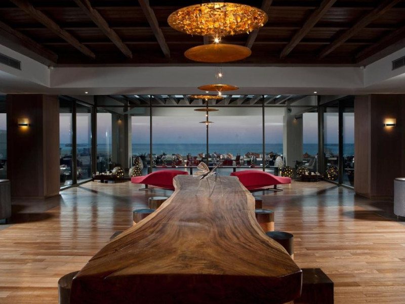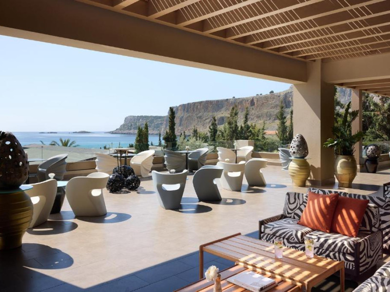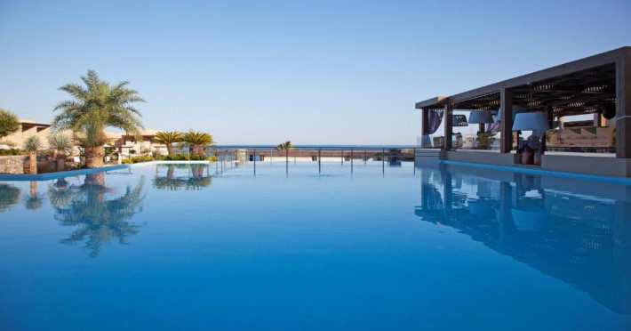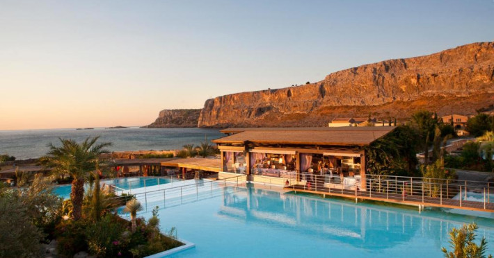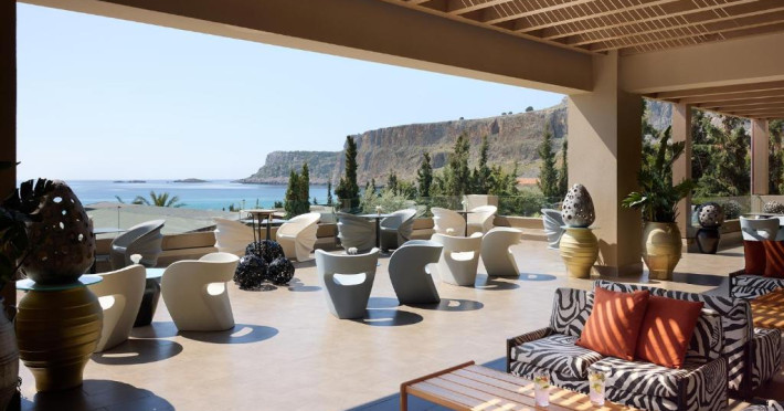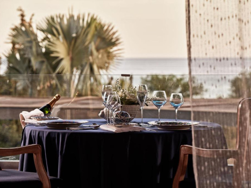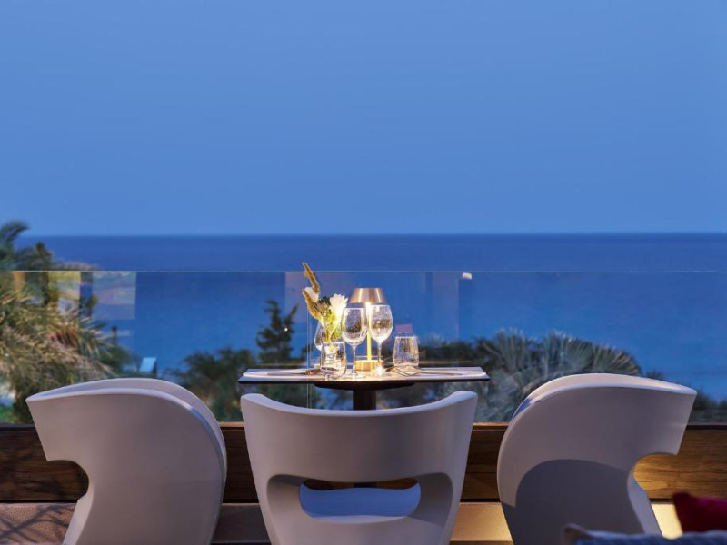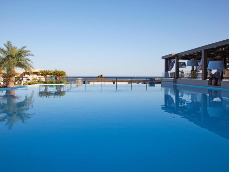 Bucătarul sef găteste preparate din bucătăria grecească si mancăruri gourmet, cu ingrediente proaspete. Oaspetii au la dispozitie un bar langă piscină, un lounge bar cu un dom impresionant si un bar pe plajă cu vedere uimitoare.