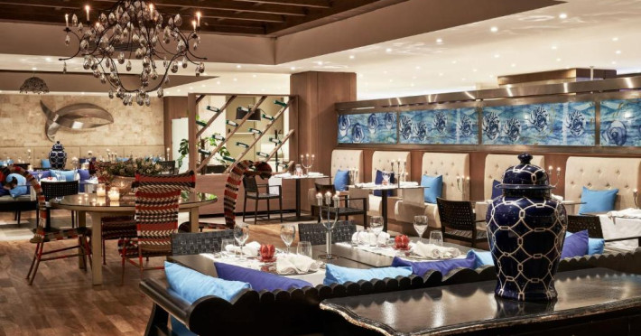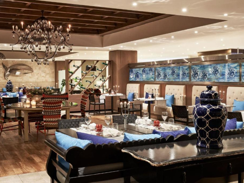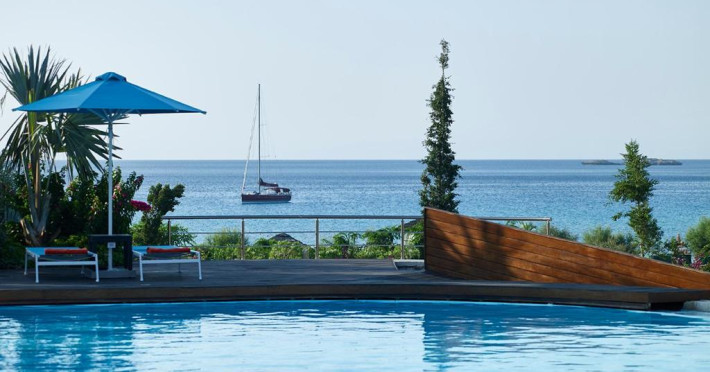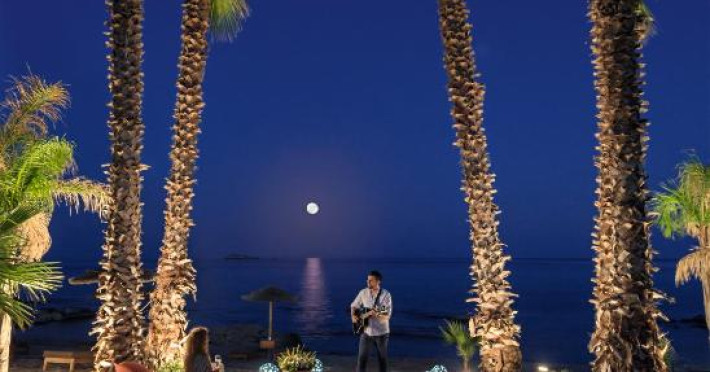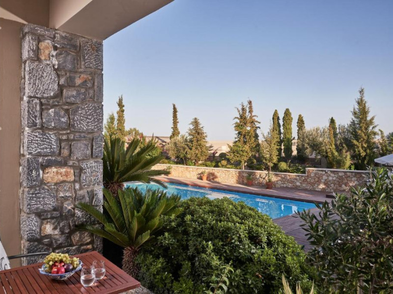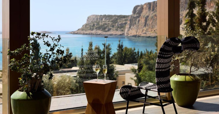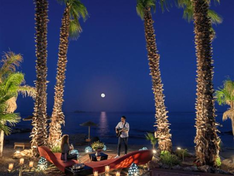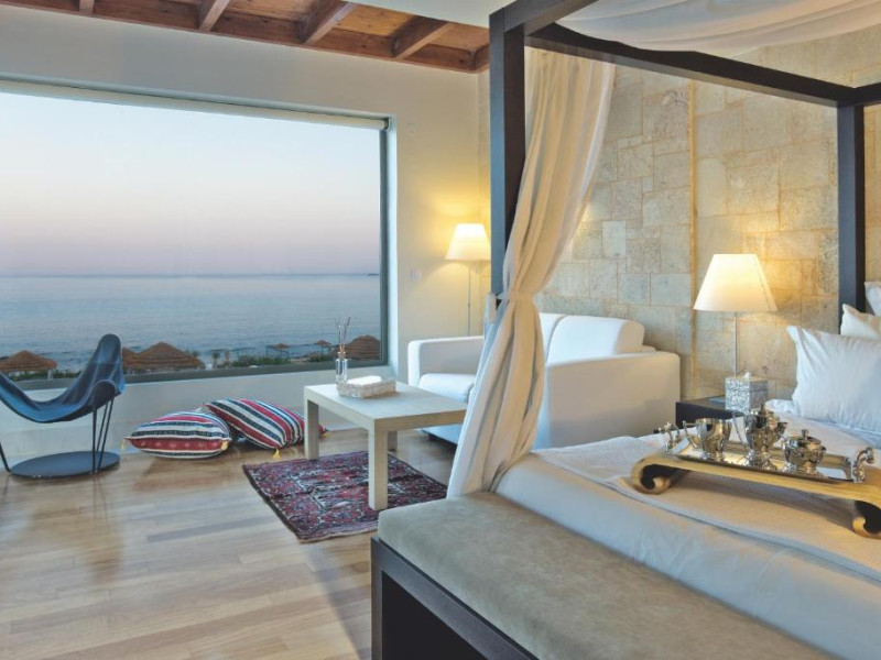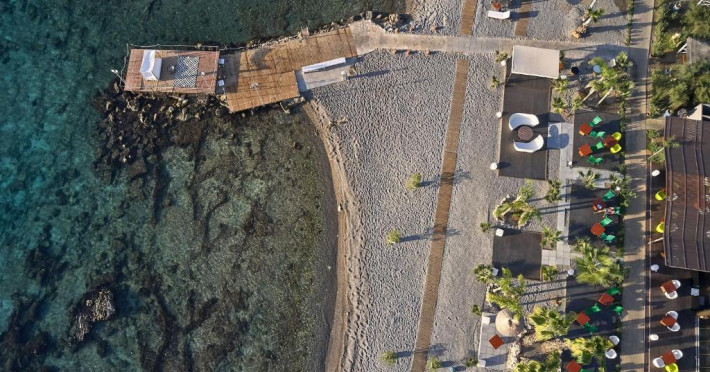 Bucătarul sef găteste preparate din bucătăria grecească si mancăruri gourmet, cu ingrediente proaspete. Oaspetii au la dispozitie un bar langă piscină, un lounge bar cu un dom impresionant si un bar pe plajă cu vedere uimitoare.