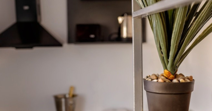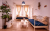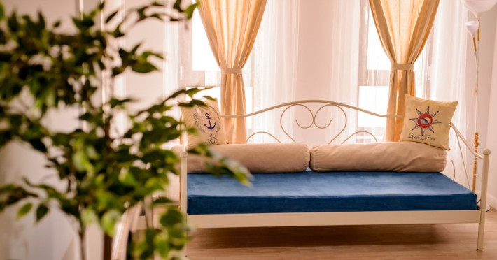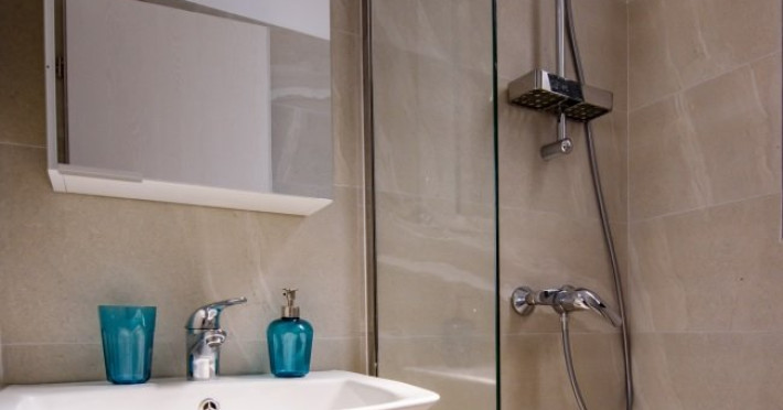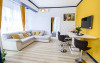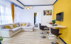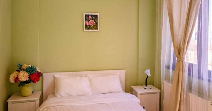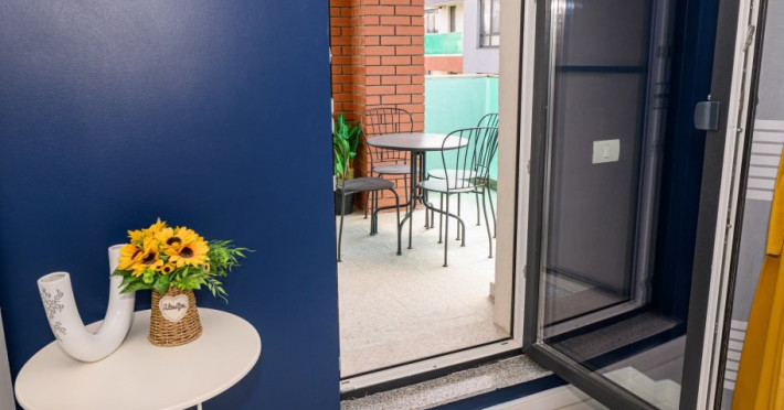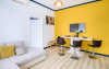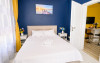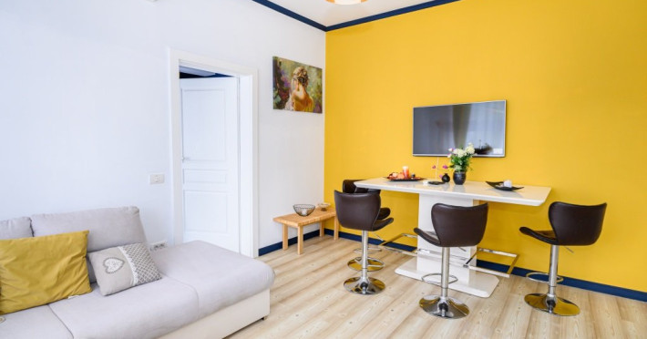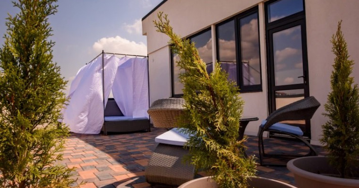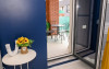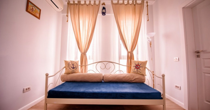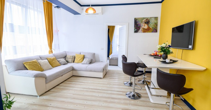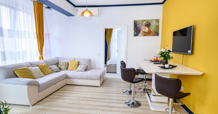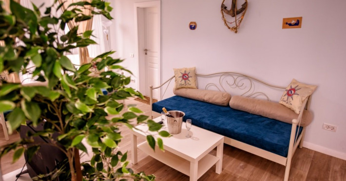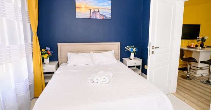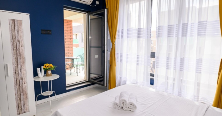 Garsoniera 114 - se afla la etajul 4 si se compune dintr-un hol de acces echipat cu loc de luat masa, un dormitor matrimonial cu pat de 160x200 si terasa mobilata. Aer conditionat este pe hol, iar TV cu diagonala de 81 cm in dormitor. Suprafata 54 mp.