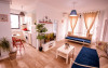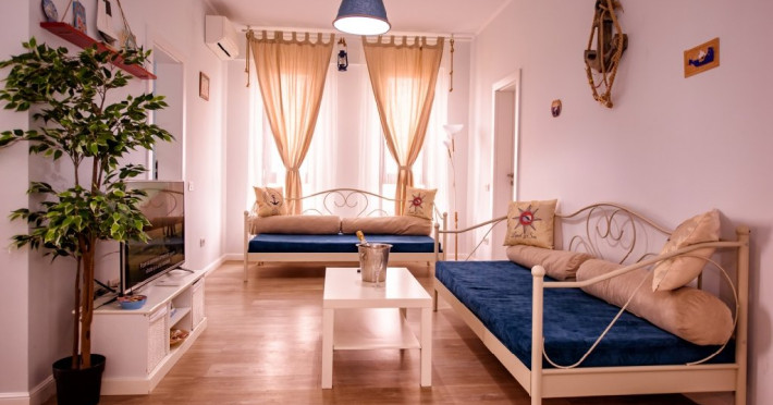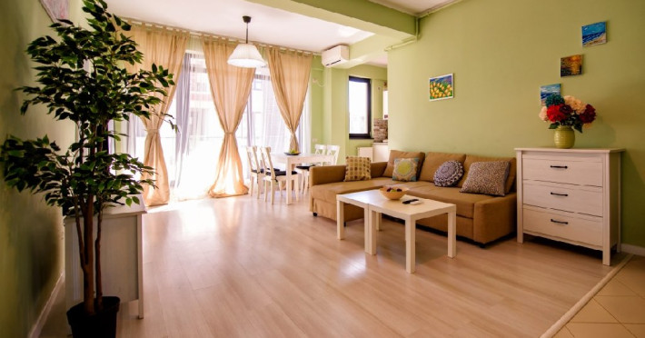 Apartamentul 111 - este situat la etajul 3 si dispune de un living cu canapea extensibila (160x200) cu loc de servit masa, un dormitor matrimonial cu pat de 160x200 si o terasa mobilata. Aer conditionat exista doar in living, iar TV in ambele camere . Suprafata 48 mp.