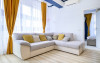 Apartamentul 112 - este situat la etajul 3 si dispune de 2 terase mobilate, un living cu canapea extensibila (160x200) si loc de servit masa, doua dormitoare matrimoniale cu pat de 160x200. Exista aer conditionat si tv in toate cele 3 camere. Suprafata 75 mp.