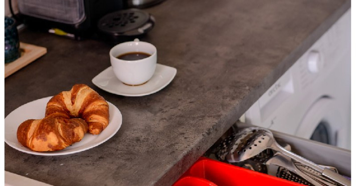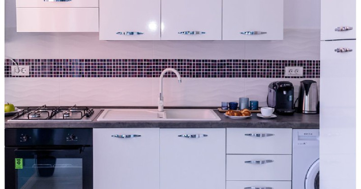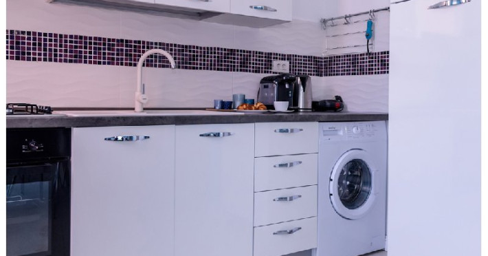 - Bucatarie: plita, cuptor, hota, frigider, espressor, sandwich maker, prajitor de paine, fierbator de apa, masina de spalat rufe