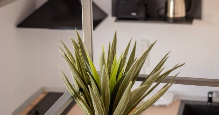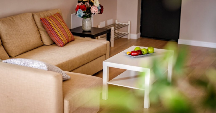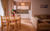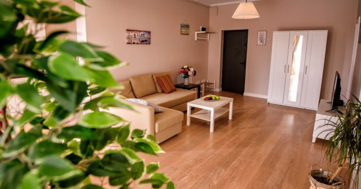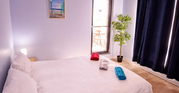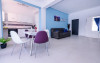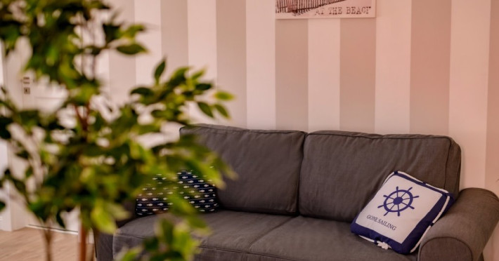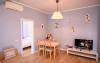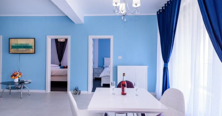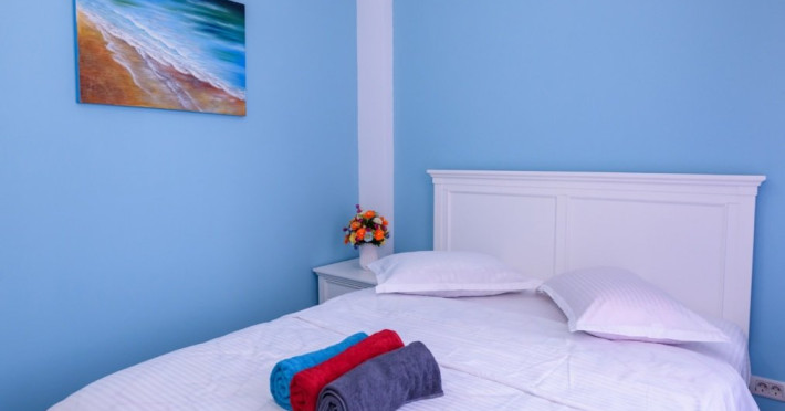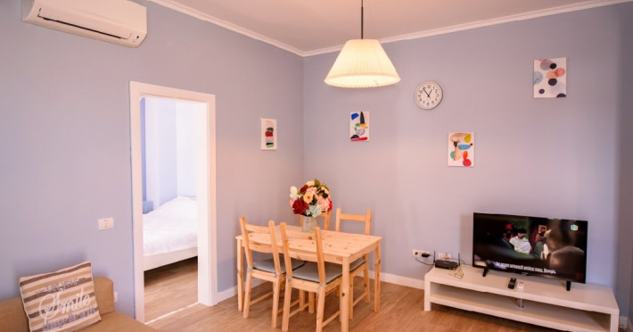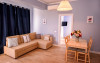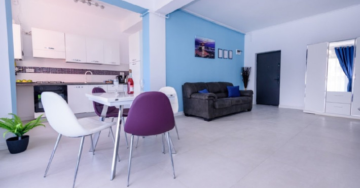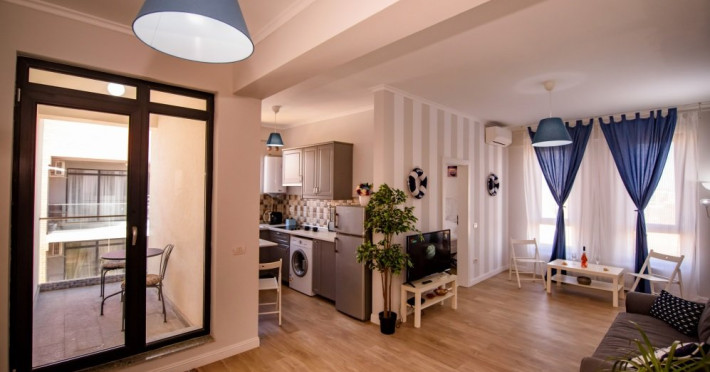 Garsoniera 214 - se afla la etajul 4 si se compune dintr-un hol de acces echipat cu loc de luat masa, un dormitor matrimonial cu pat de 160x200 si terasa mobilata. Aer conditionat este pe hol, iar LED TV cu diagonala de 81 cm in dormitor. Suprafata 54 mp.
