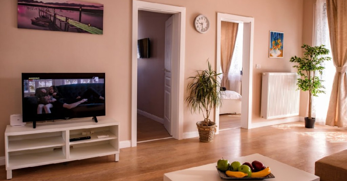 Apartamentul 213 - este situat la etajul 3 si dispune de o terasa mobilata, un living cu canapea extensibila (160x200) si loc de servit masa, doua dormitoare matrimoniale (unul cu pat de 160x200, celalat cu pat de 140x200). Exista aer conditionat in living si tv in toate cele 3 camere . Suprafata 65 mp.