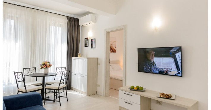 - Living: Canapea extensibila 2 persoane (160 x 200 cm), aer conditionat, dulap haine, masa si scaune pt servit mancarea, TV smart 108 cm diagonala, masa de calcat, fier de calcat, uscator de rufe