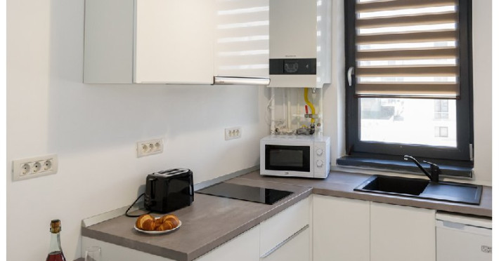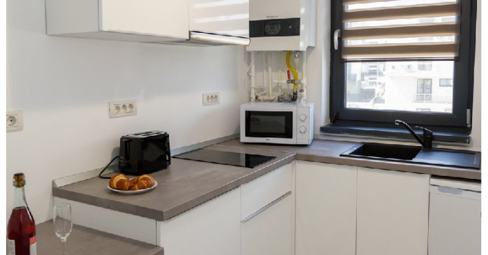 - Bucatarie: plita, hota, frigider, espressor, sandwich maker, prajitor de paine, fierbator de apa, masina de spalat rufe