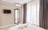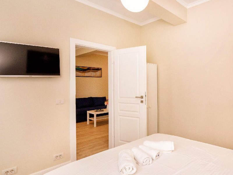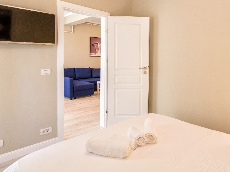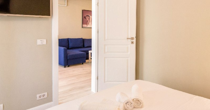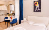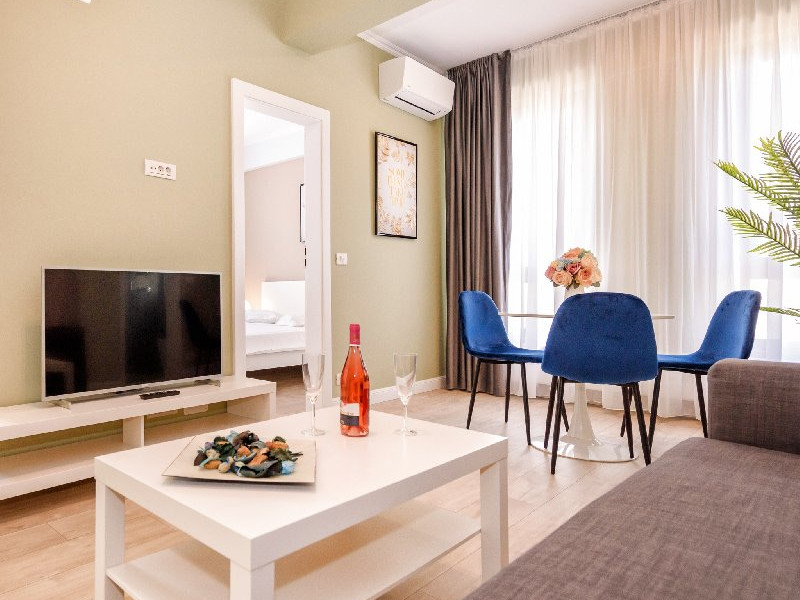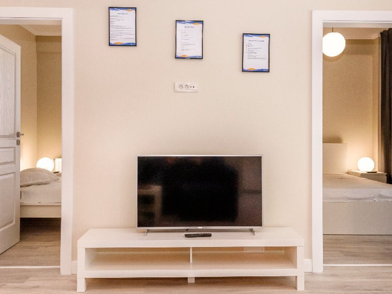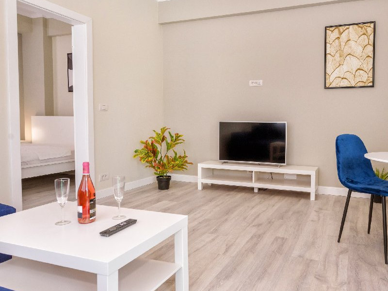 Living : Pat matrimonial (160 x 200 cm) , aer conditionat , dulap haine , masa si scaune pt servit mancarea , TV smart 108 cm diagonala , masa de calcat , fier de calcat , uscator de rufe