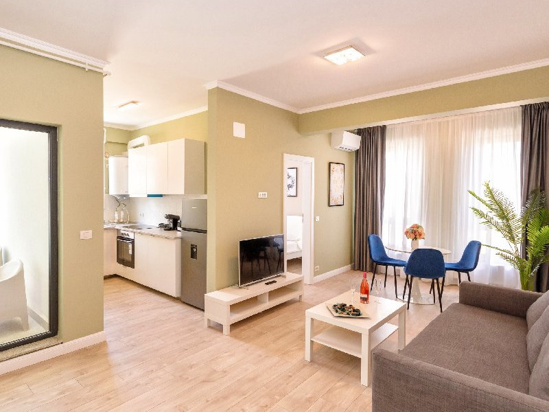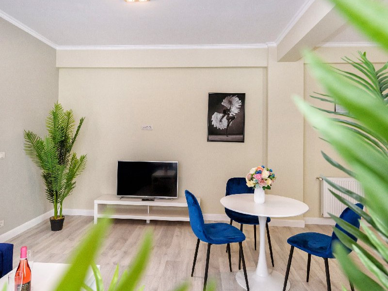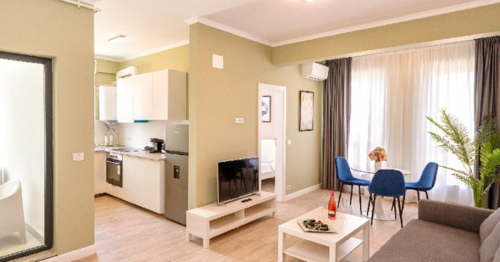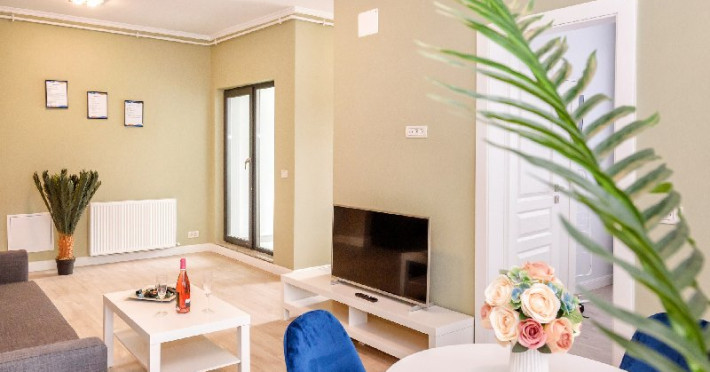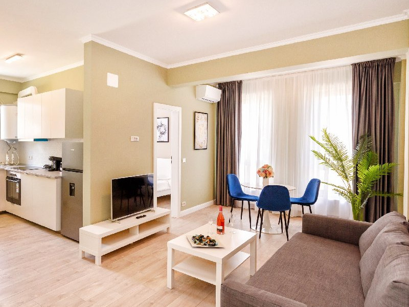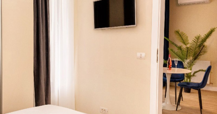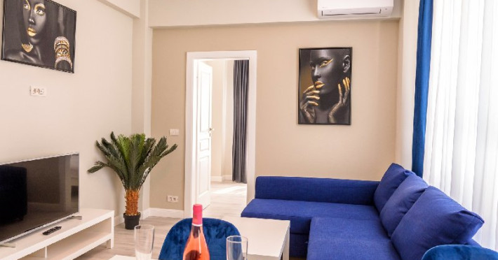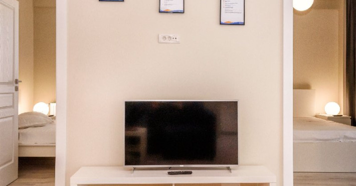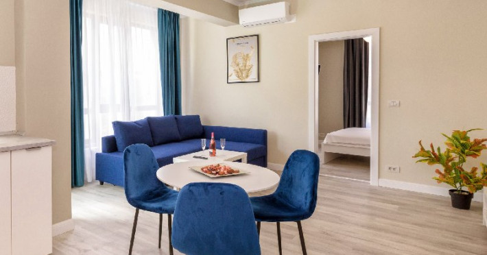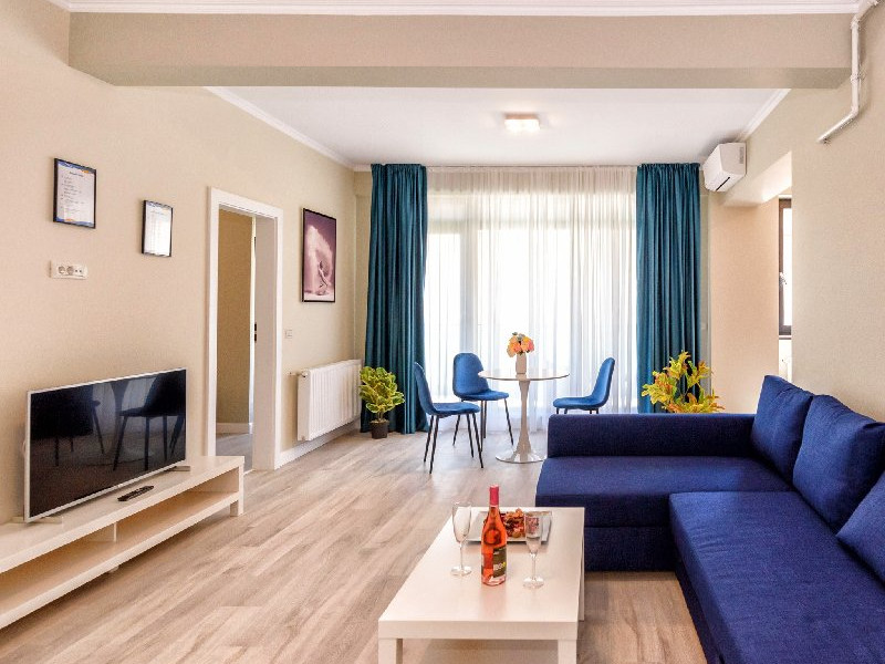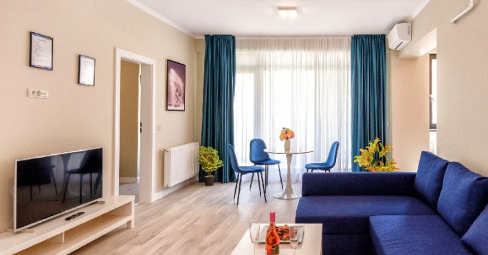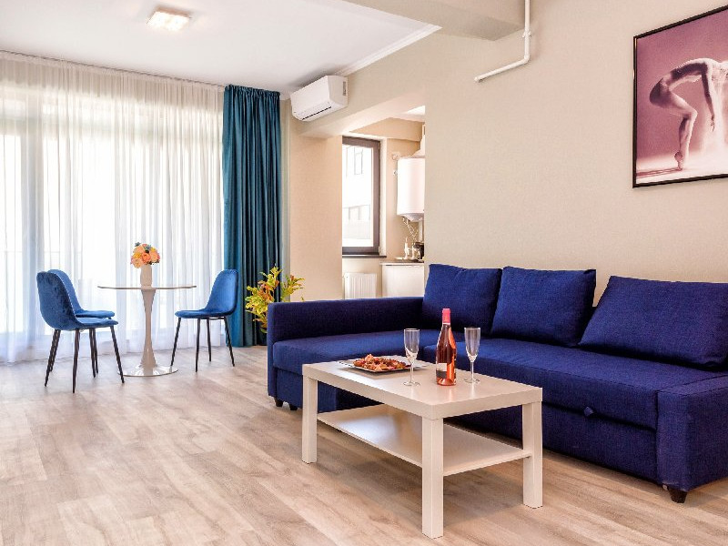 Living : Canapea extensibila 2 persoane (160 x 200 cm) , aer conditionat , dulap haine , masa si scaune pt servit mancarea , TV smart 108 cm diagonala , masa de calcat , fier de calcat , uscator de rufe