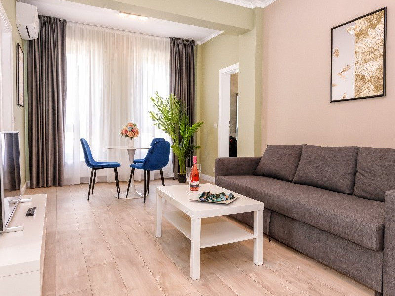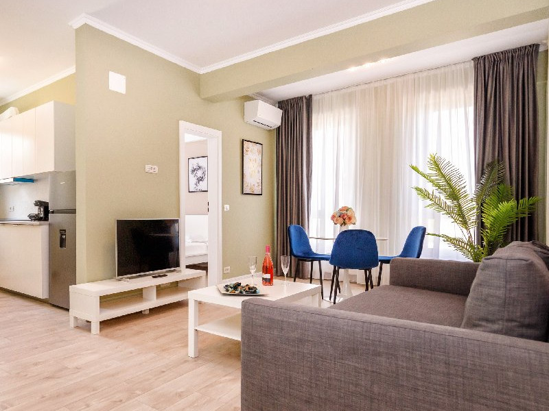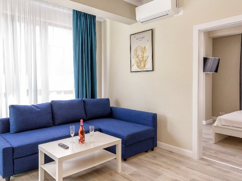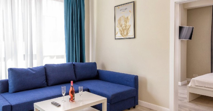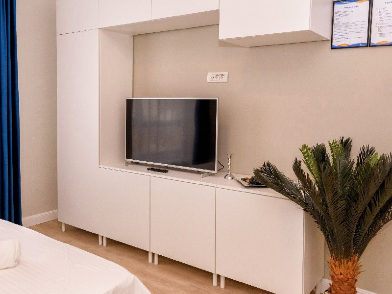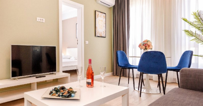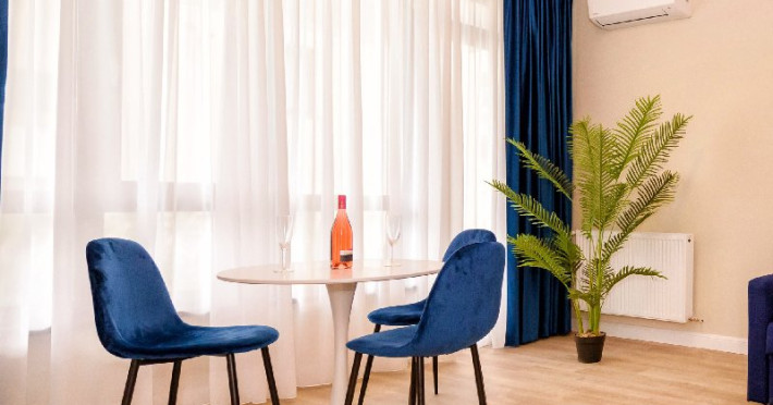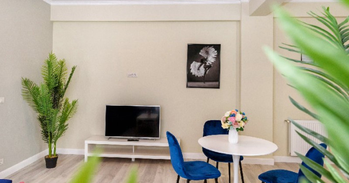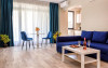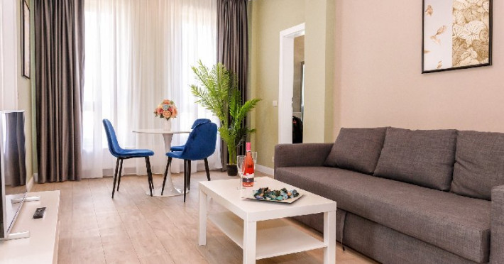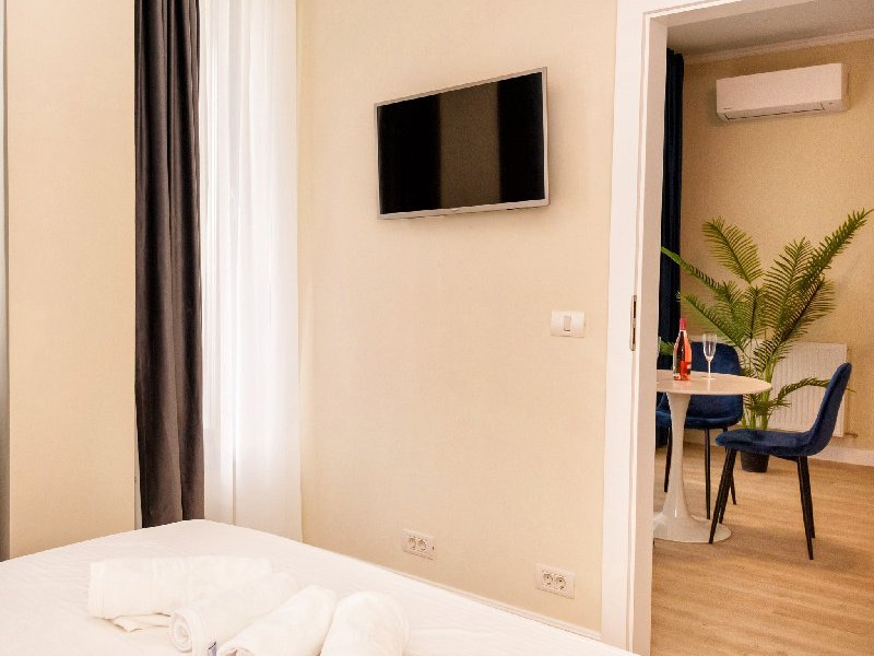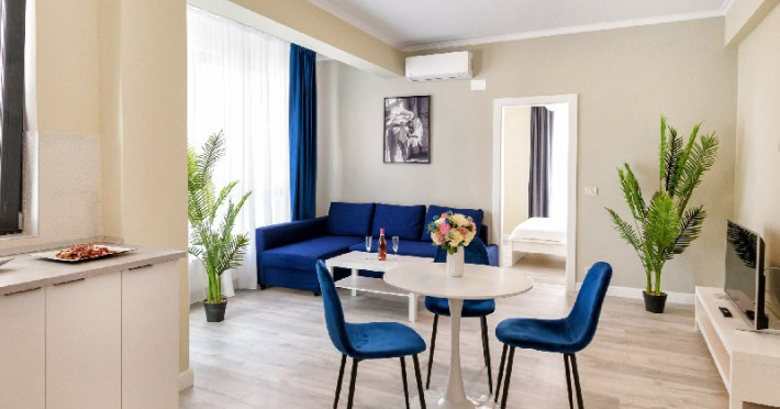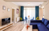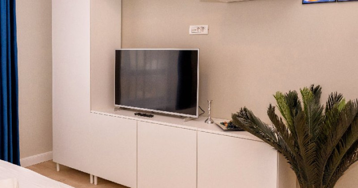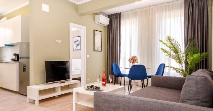 Living : Canapea extensibila 2 persoane (160 x 200 cm) , aer conditionat , dulap haine , masa si scaune pt servit mancarea , TV smart 108 cm diagonala , masa de calcat , fier de calcat , uscator de rufe