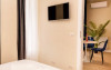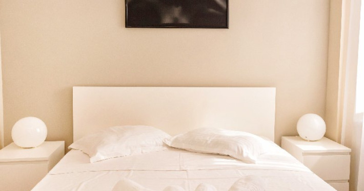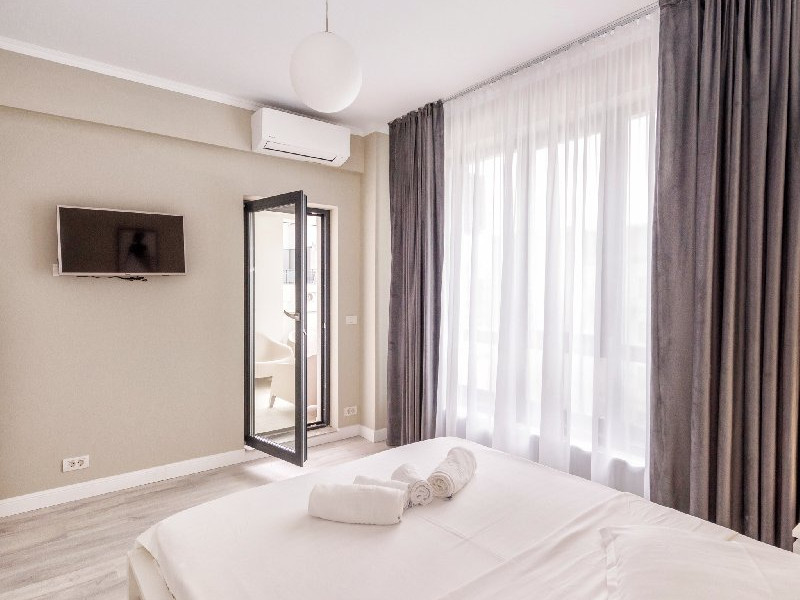 Dormitor 1 : Pat matrimonial (160 x 200 cm), TV LED diagonala 81 cm, dulap haine, uscator de par, aer conditionat