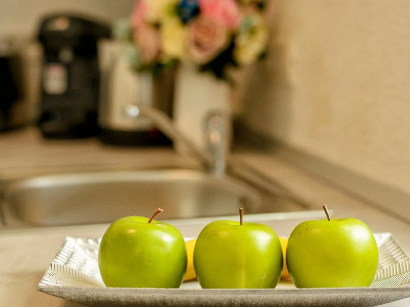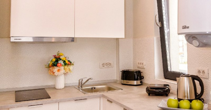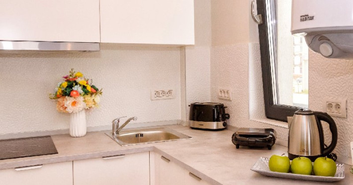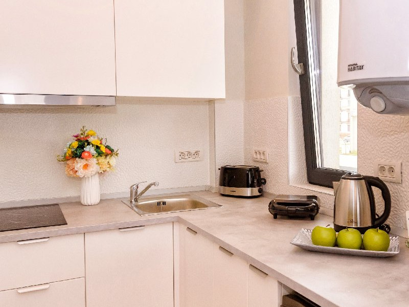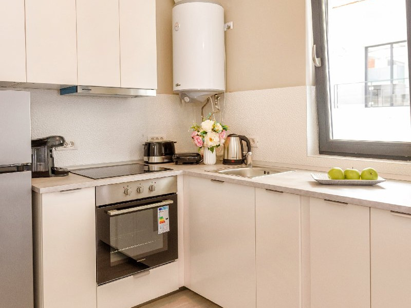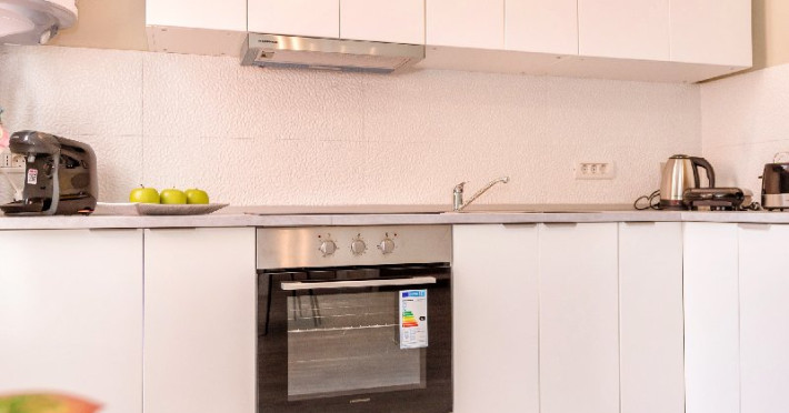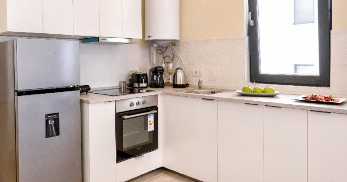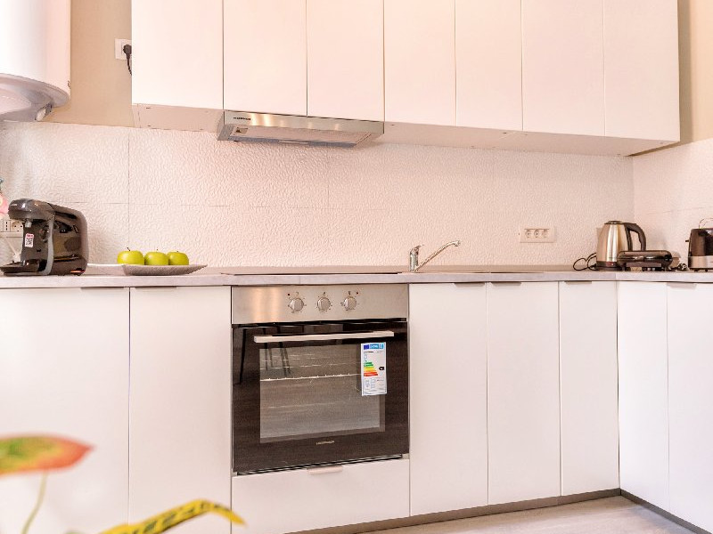 Bucatarie : plita , cuptor , hota , frigider , masina de spalat , espressor , sandwich maker , prajitor de paine , fierbator de apa