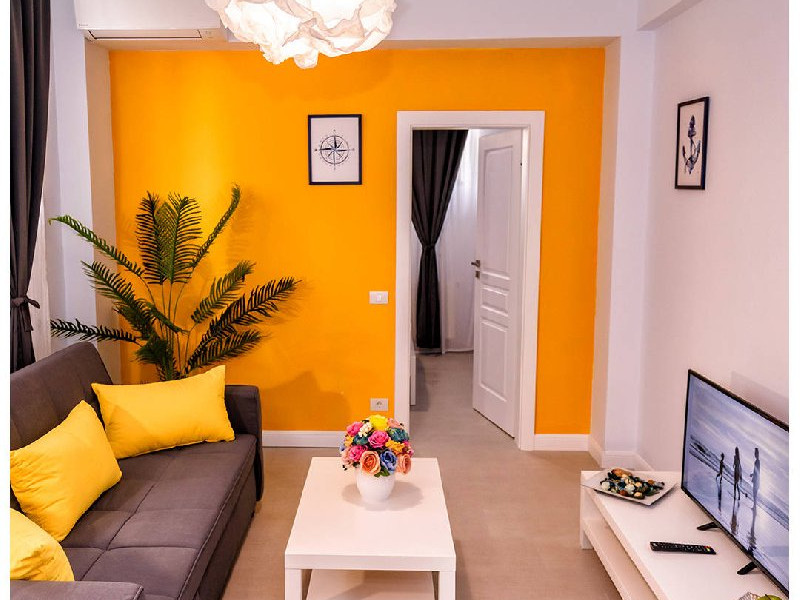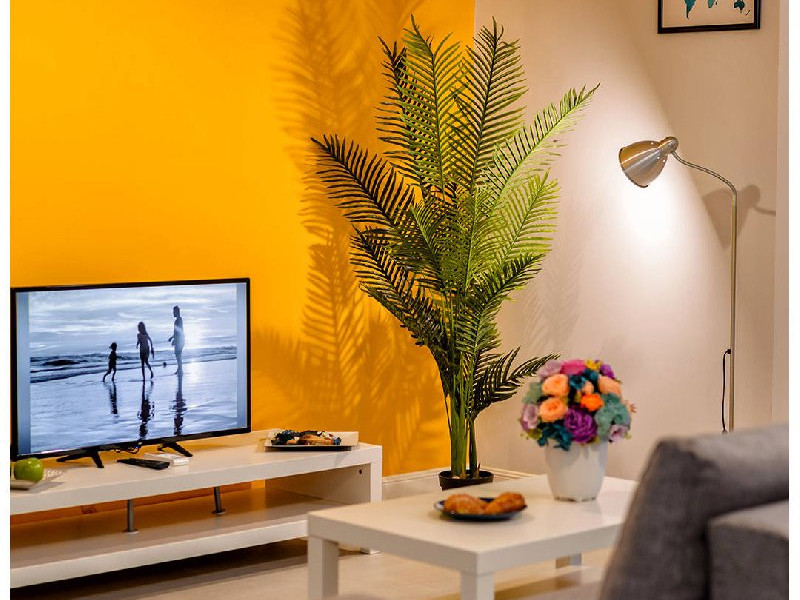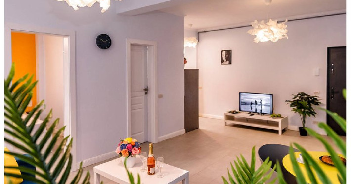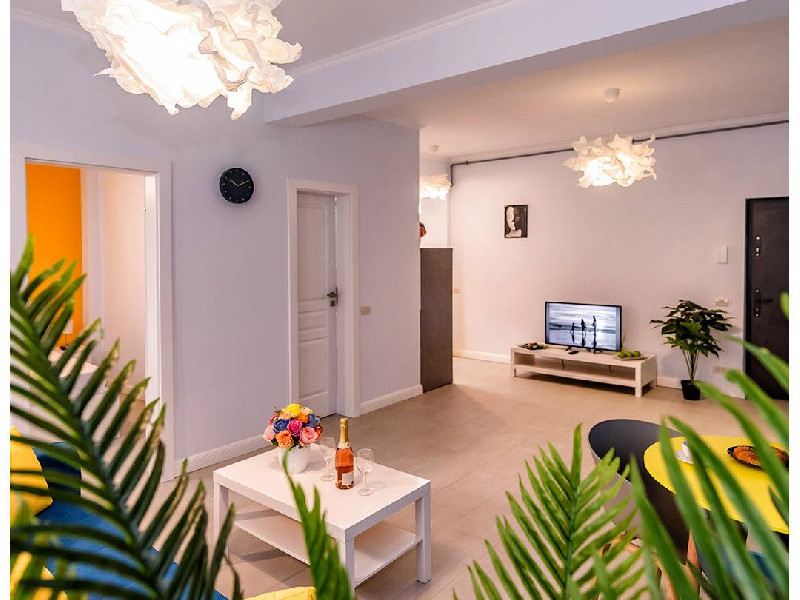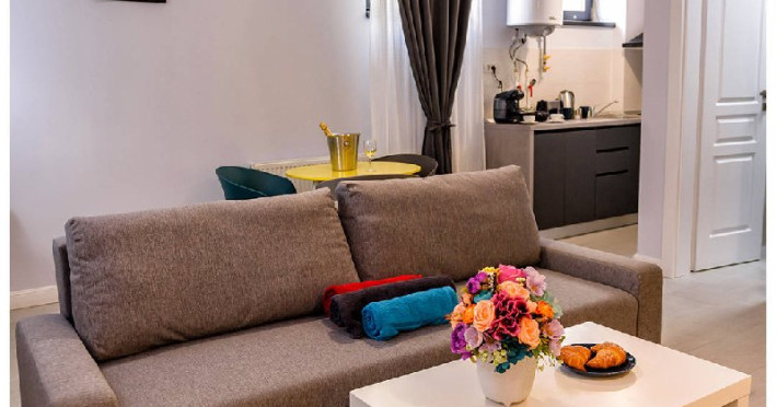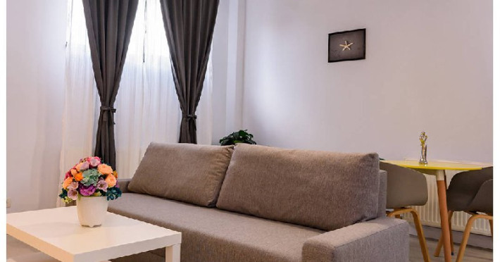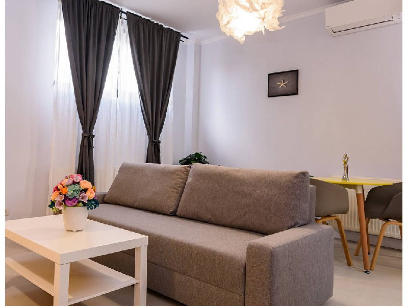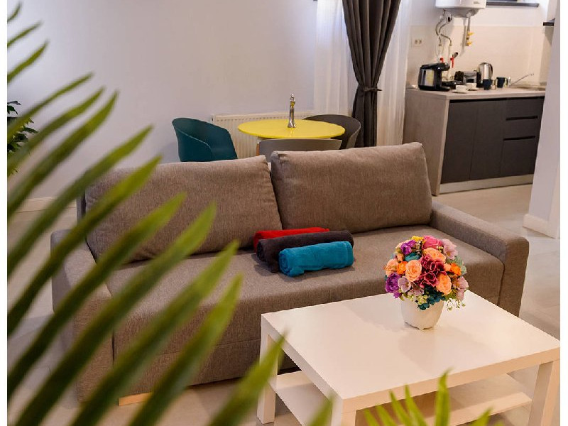 Living : Canapea extensibila 2 persoane (160 x 200 cm) , aer conditionat , dulap haine , masa si scaune pt servit mancarea , TV smart 108 cm diagonala , masa de calcat , fier de calcat , uscator de rufe