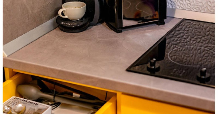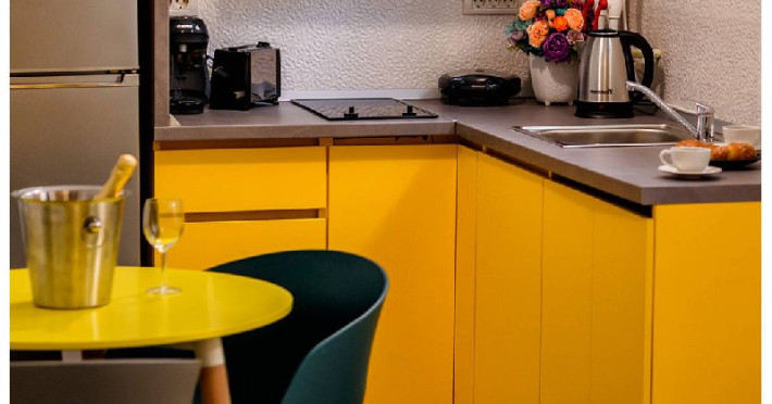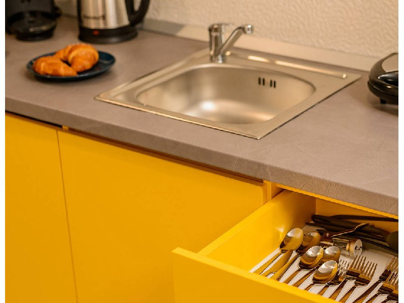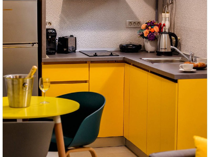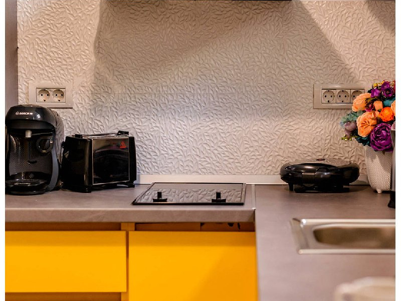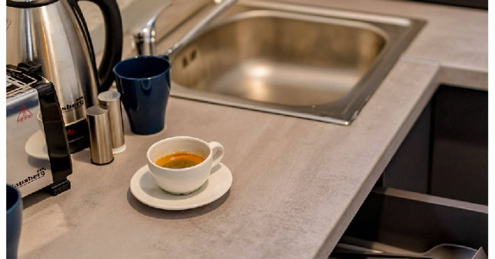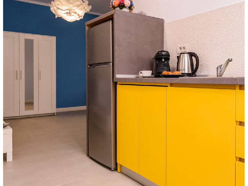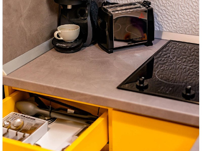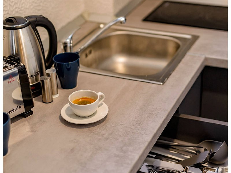 Bucatarie : plita , cuptor , hota , frigider , masina de spalat , espressor , sandwich maker , prajitor de paine , fierbator de apa