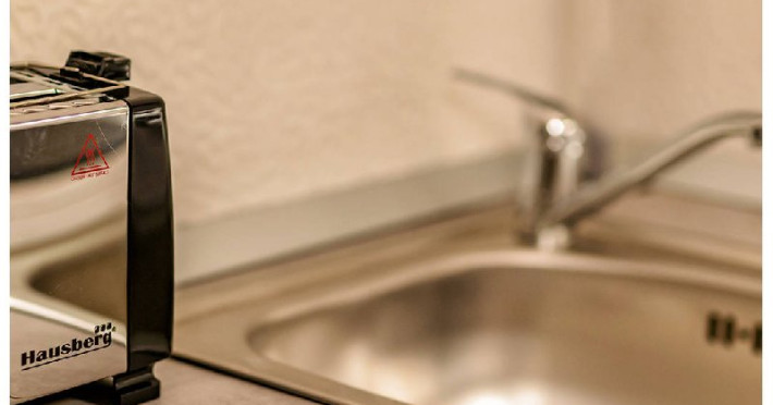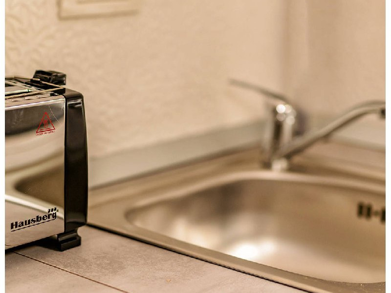 Bucatarie : plita , hota , frigider , espressor , sandwich maker , prajitor de paine , fierbator de apa , masina de spalat rufe