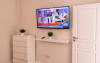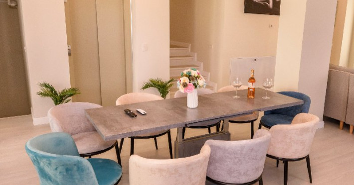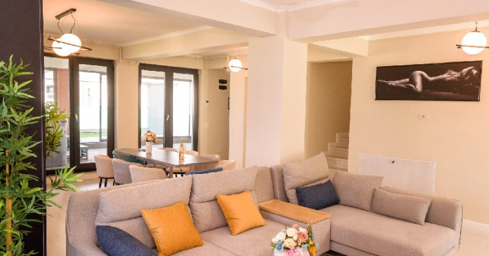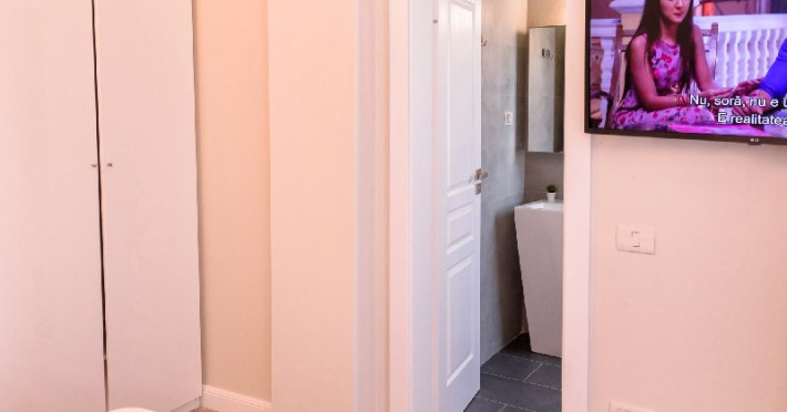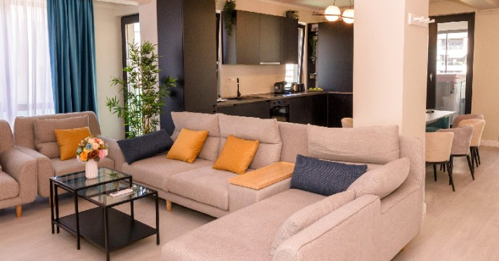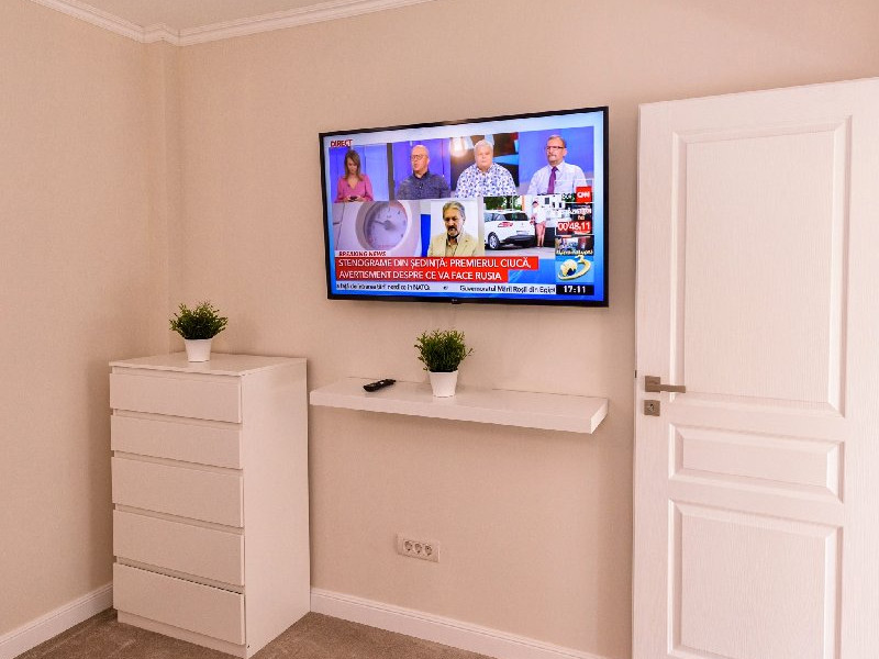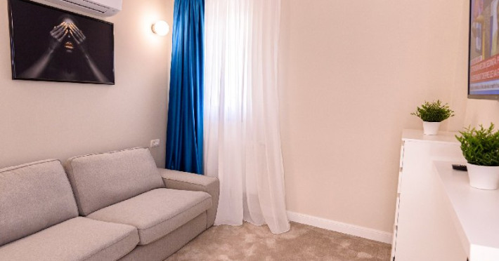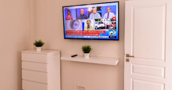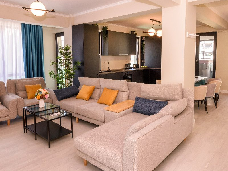 Living 1 : Canapele fixe , aer conditionat , cuier haine, masa si scaune pt servit mancarea , TV smart 140 cm diagonala , masa de calcat , fier de calcat , uscator de rufe