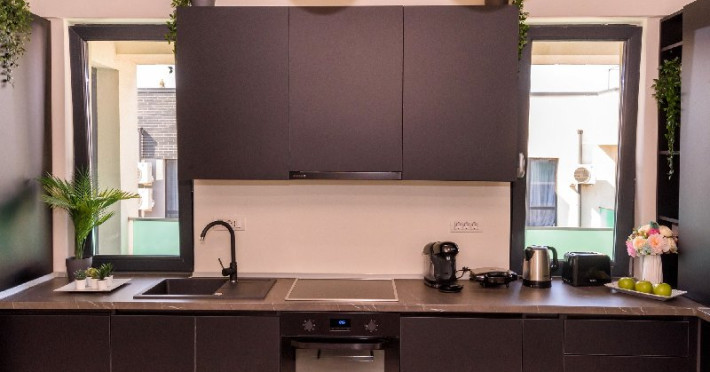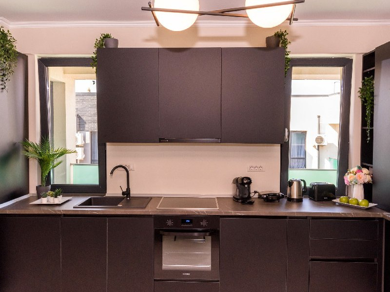 Bucatarie : plita , cuptor , hota , frigider , espressor , sandwich maker , prajitor de paine , fierbator de apa , masina de spalat rufe , masina de spalat vase