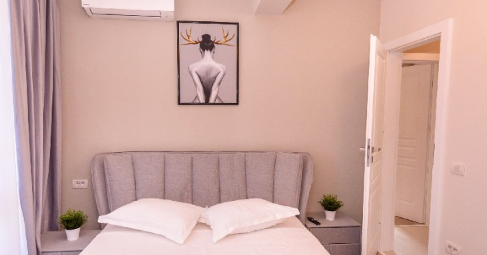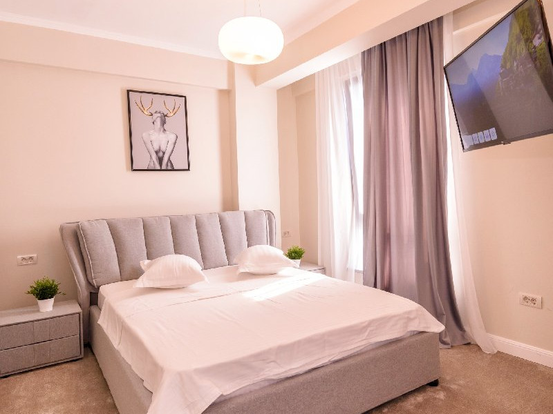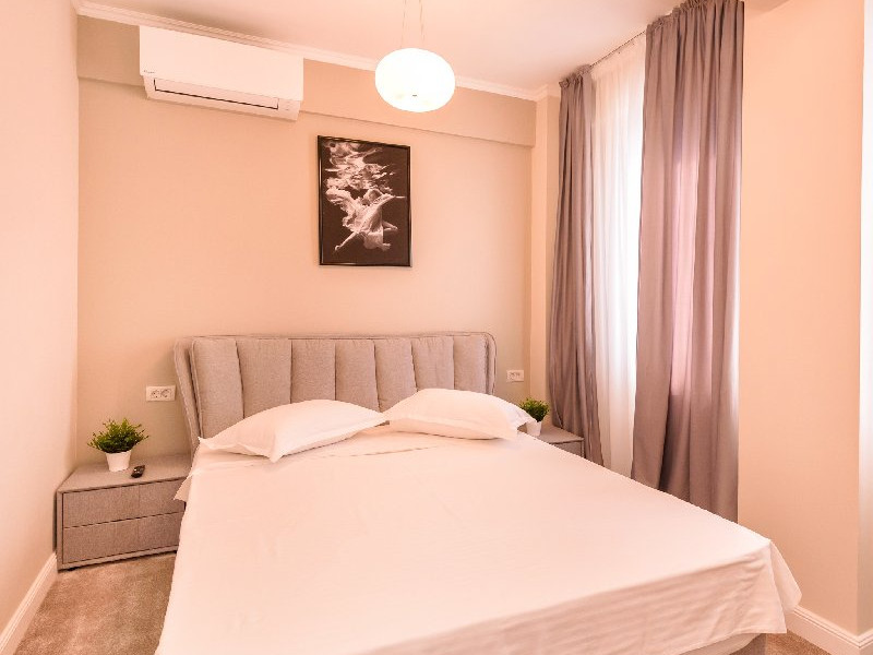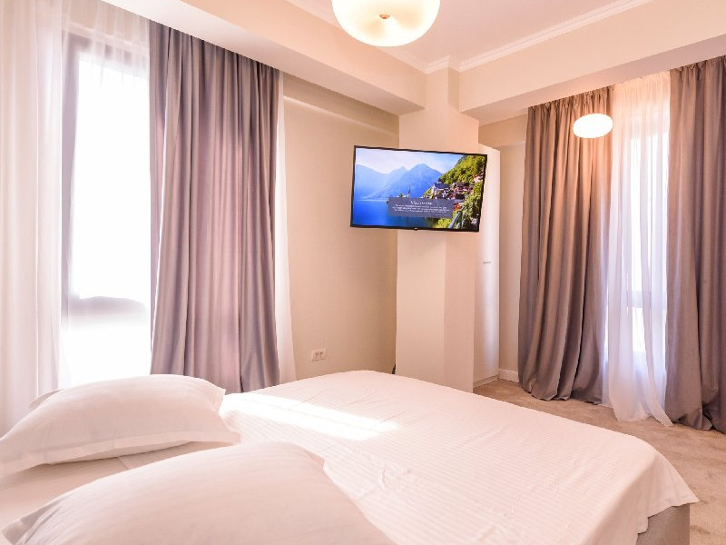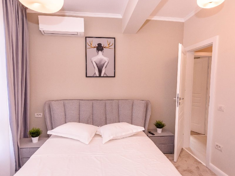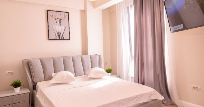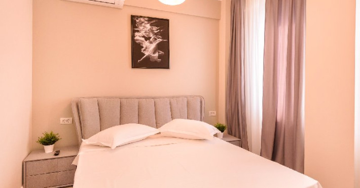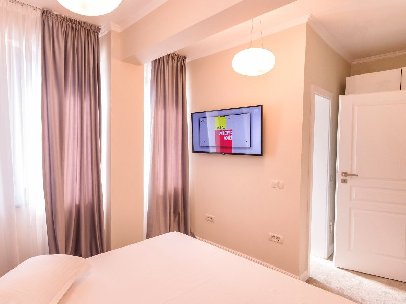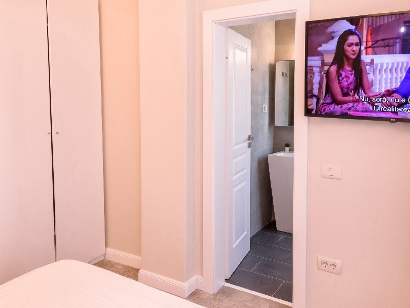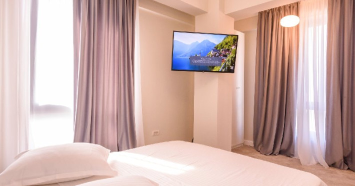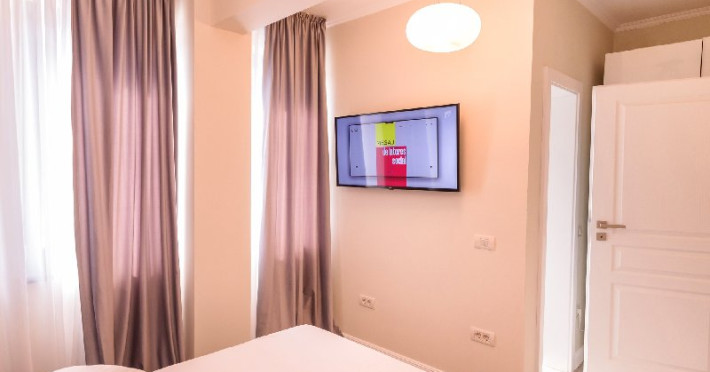 Dormitor 1 : Pat matrimonial (160 x 200 cm) , TV smart 108 cm diagonala , dulap haine , aer conditionat