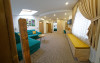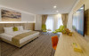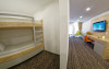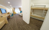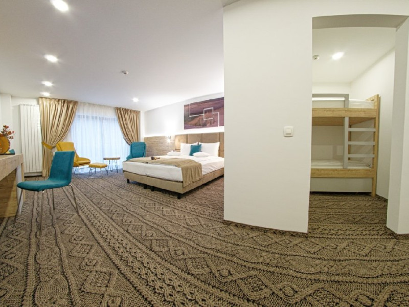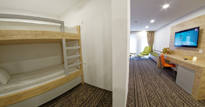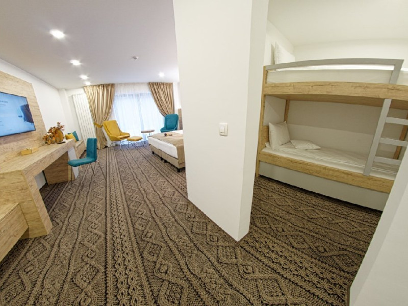 Camera family Deluxe - camerele deluxe family se afla la primul nivel al hotelului. Acestea au o suprafata de 41.5 mp., avand pat dublu matrimonial, paturi suprapuse pentru copii si baie cu dus. Camerele deluxe family pot fi cu doua paturi separate.
