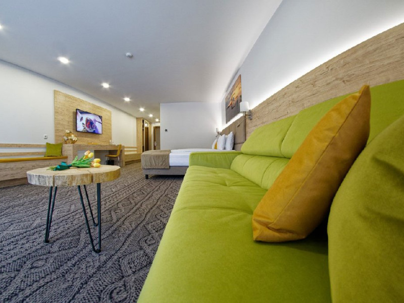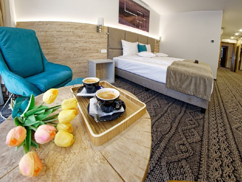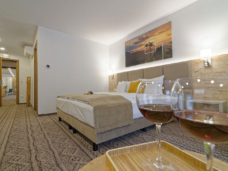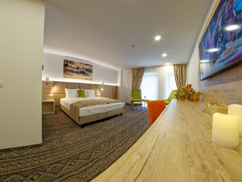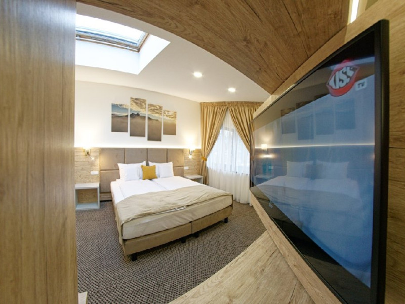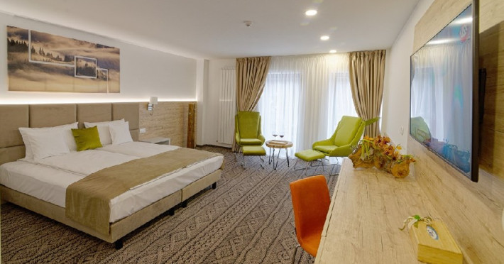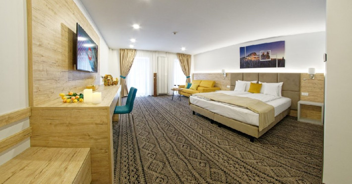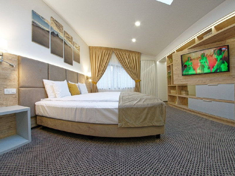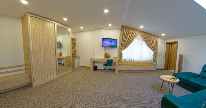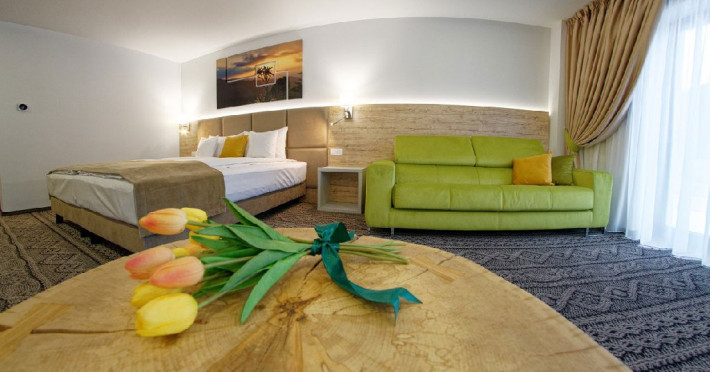 Junior Suite - suprafata generoasa, de 32 mp, compus dintr-o camera de zi spatioasa, dotata cu frigider, smartTV, canapea extensibila si o zona de dormit intima, cu pat matrimonial XL, separata de zona de zi printr-o piesa de mobilier multifunctionala, cu smartTV montat pe o placa rotativa 180 grade.